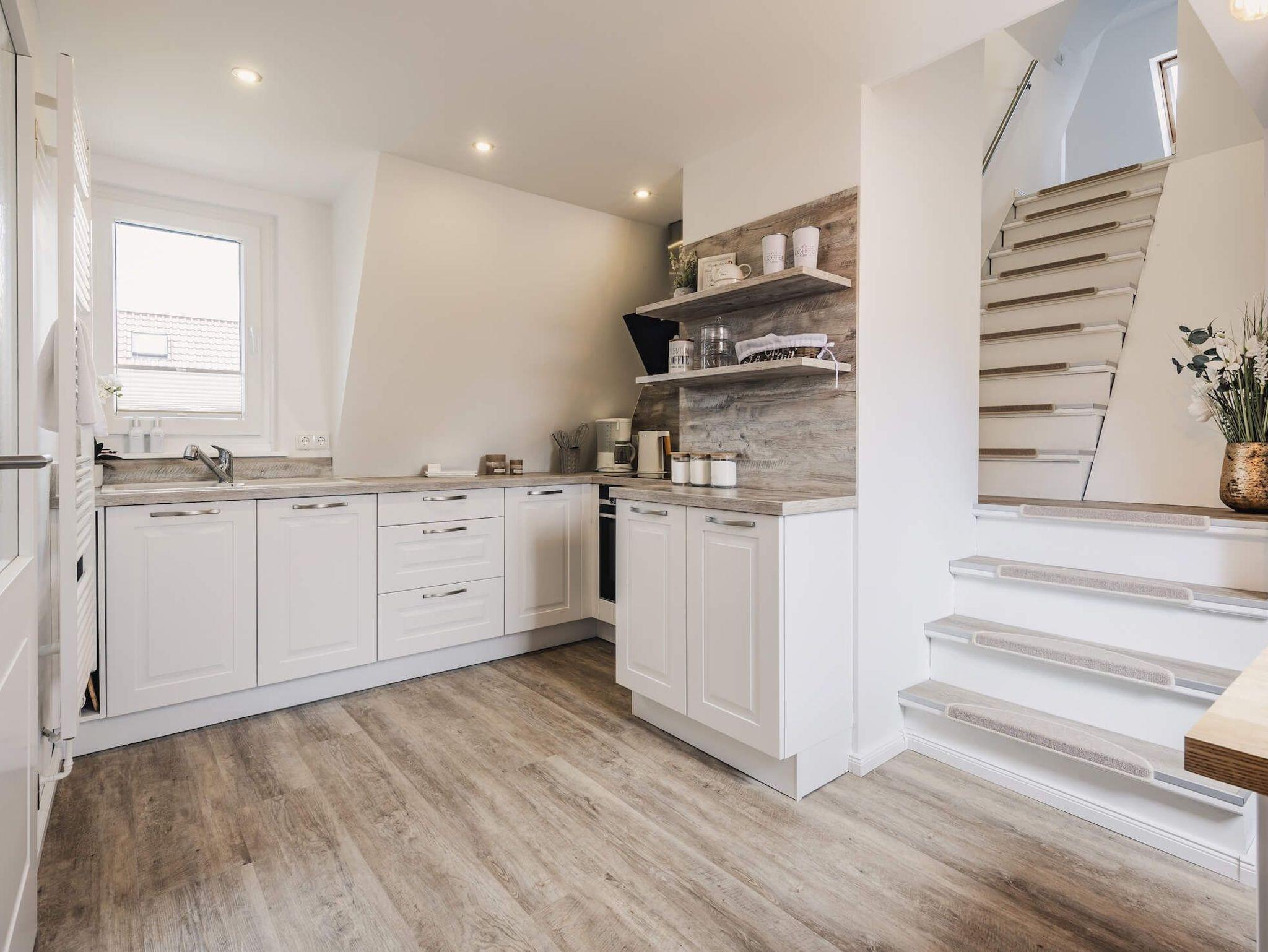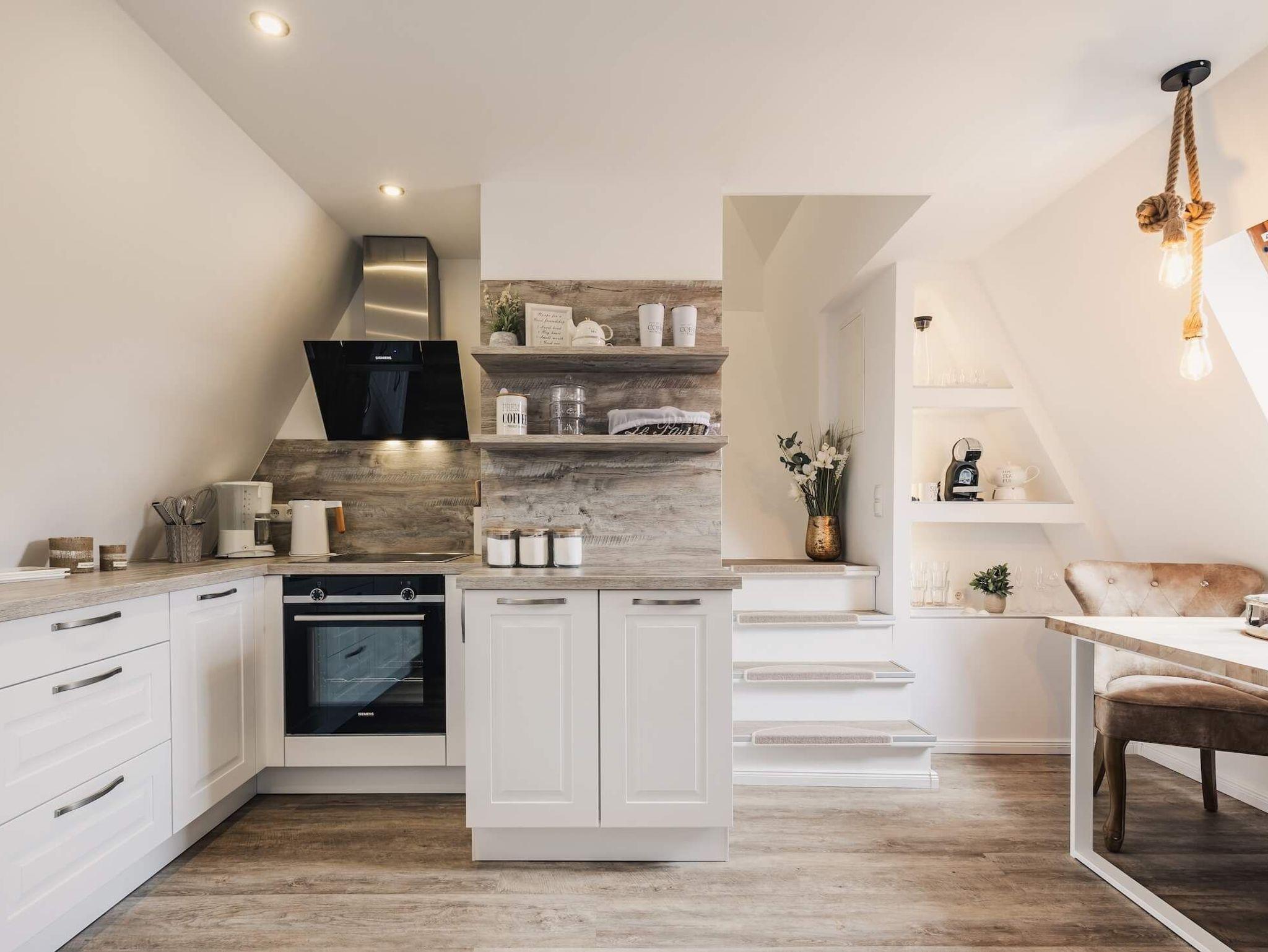 Im ersten Stock unserer Maisonette-Ferienwohnung Schwalbennest erwartet Sie ein durchdacht gestalteter Bereich, der Ihnen alles für einen entspannten Start in den Tag bietet. Hier finden Sie ein gemütliches Schlafzimmer mit einem komfortablen Doppelbett, das Ihnen erholsame Nächte garantiert. Direkt angrenzend befindet sich ein modernes Badezimmer mit einer geräumigen Dusche, in dem Sie sich nach einem ereignisreichen Tag erfrischen können. Die voll ausgestattete Küche lässt keine Wünsche offen und bietet Ihnen die Möglichkeit, sich selbst zu versorgen und kulinarische Köstlichkeiten zuzubereiten.