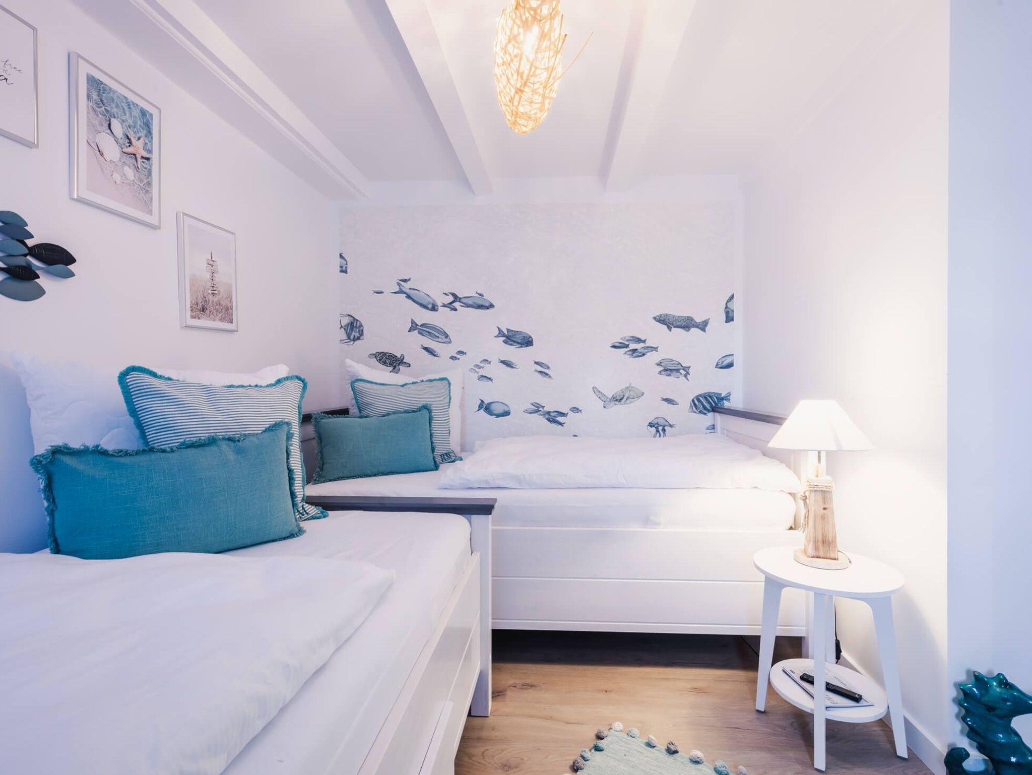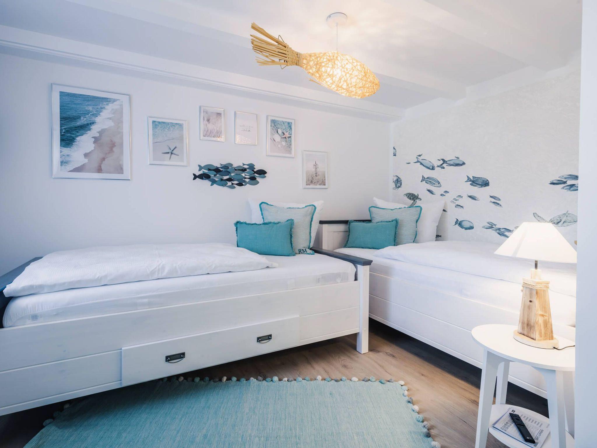 EG: Auf dieser Ebene finden Sie zwei Schlafzimmer, eines mit Boxspring-Doppelbett (180x200cm) und eines mit 2 Einzelbetten (90x200) sowie ein großes Badezimmer mit Dusche und WC.