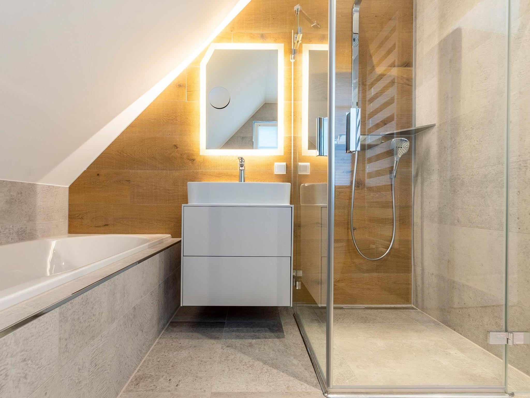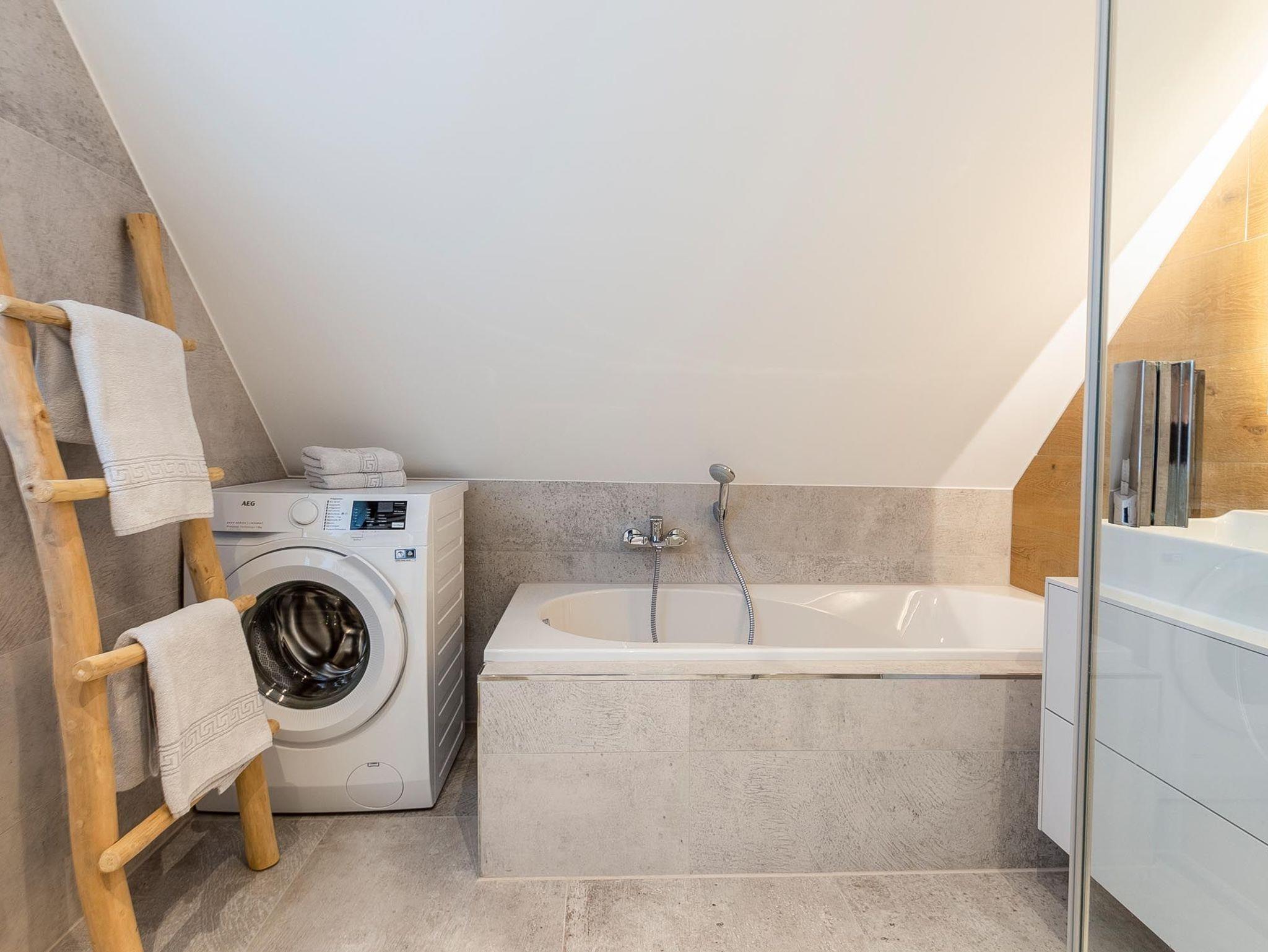 Das ansprechend eingerichtete Badezimmer verfügt über eine bodengleiche Dusche, eine Badewanne sowie eine Waschmaschine.