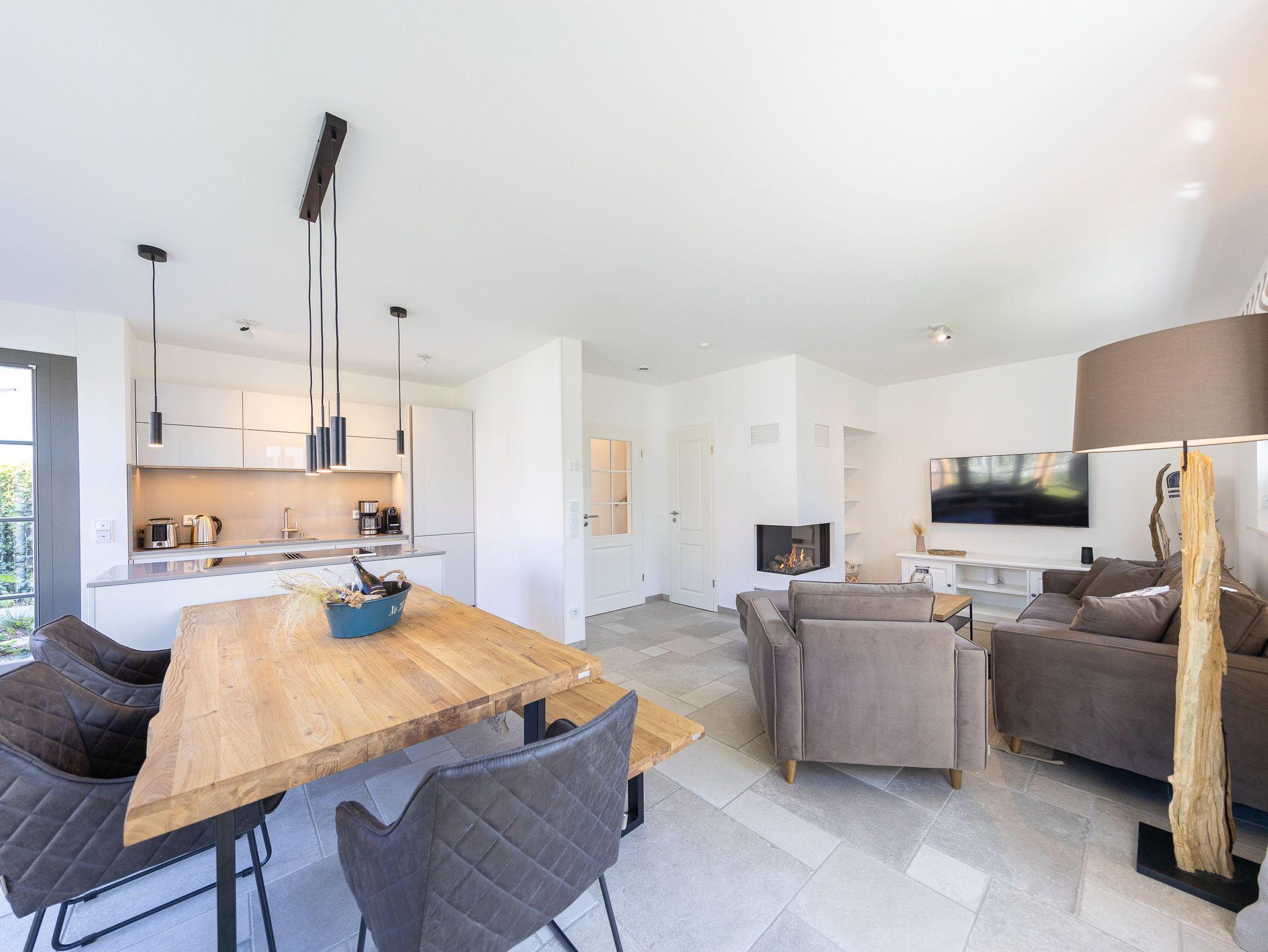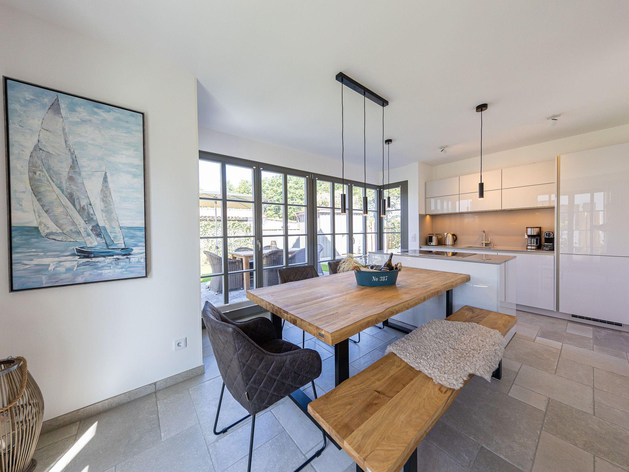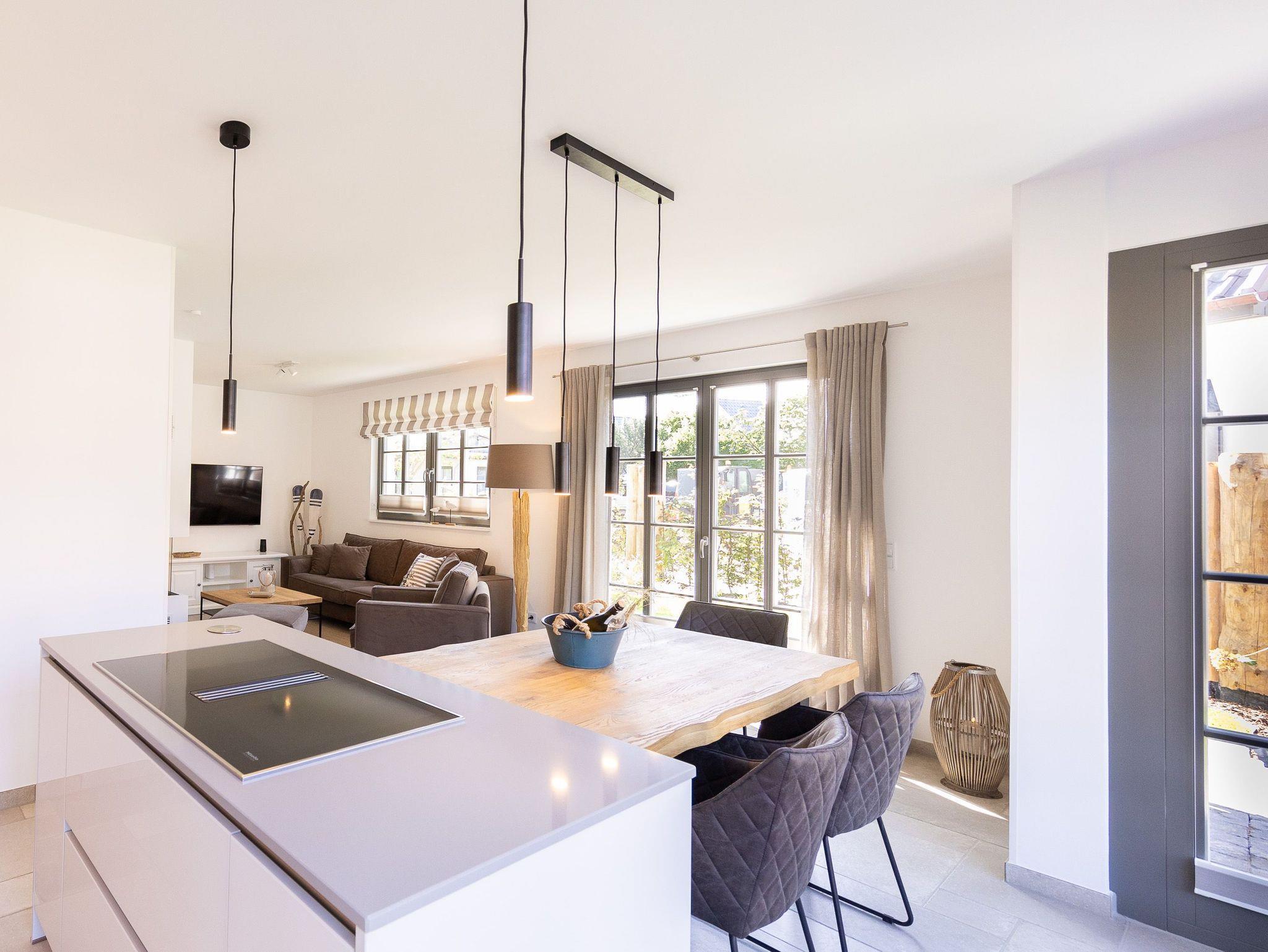 Das Ferienhaus besticht durch seine charmante und einladende Einrichtung. Dies verfügt über eine moderne Wohnküche mit Markengeräten, in der Sie gemeinsame Mahlzeiten zubereiten können. Der angrenzende Essbereich bietet Platz für die ganze Familie und ist der perfekte Ort, um gemeinsam zu essen oder Spieleabende zu veranstalten. Der offene Wohnbereich ist gemütlich und hochwertig ausgestattet und Sie können die Abende am Kamin genießen. Die großen Fenster lassen viel Sonnenlicht herein und schaffen eine angenehme Atmosphäre.