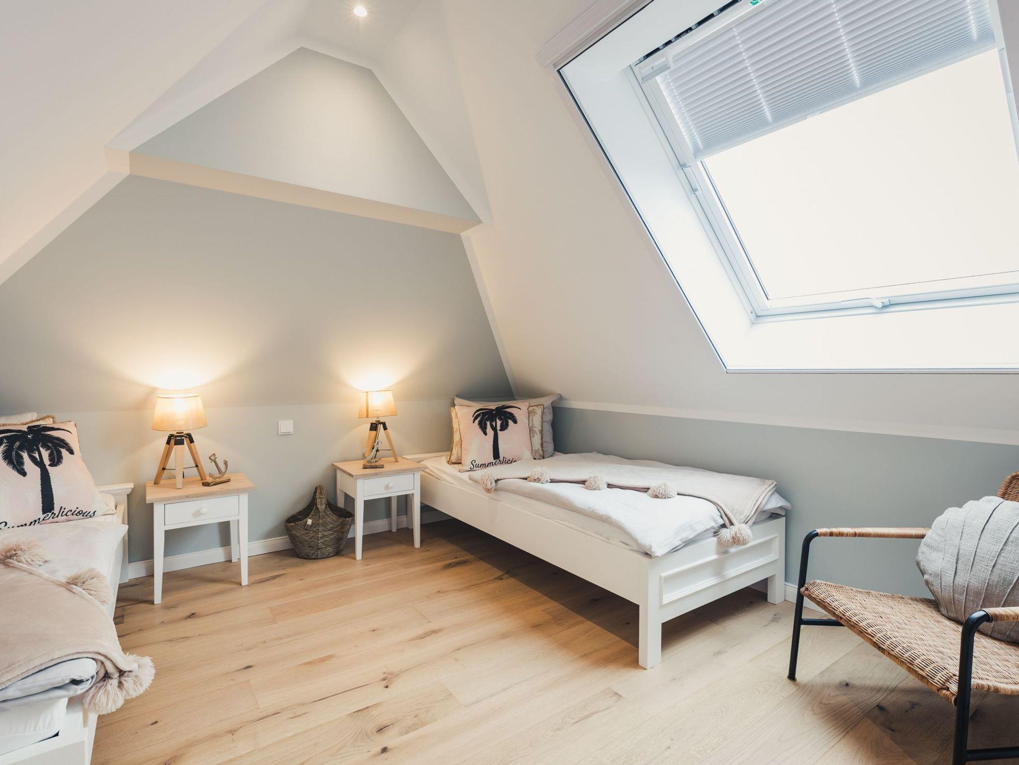 Im Dachgeschoss finden Sie ein weiteres großzügiges und gemütliches Schlafzimmer mit zwei Einzelbetten, Einbauschrank und Flatscreen-TV.