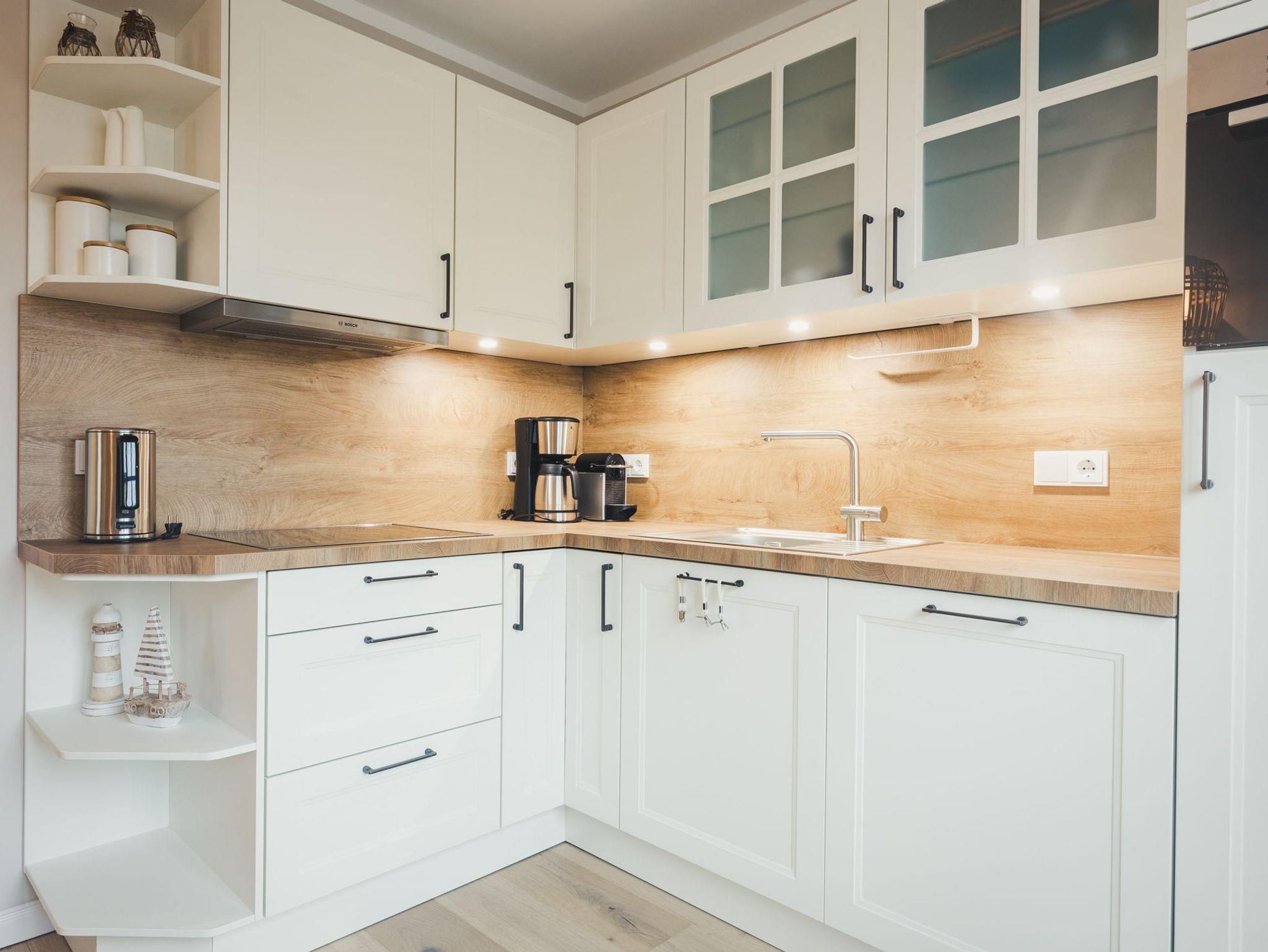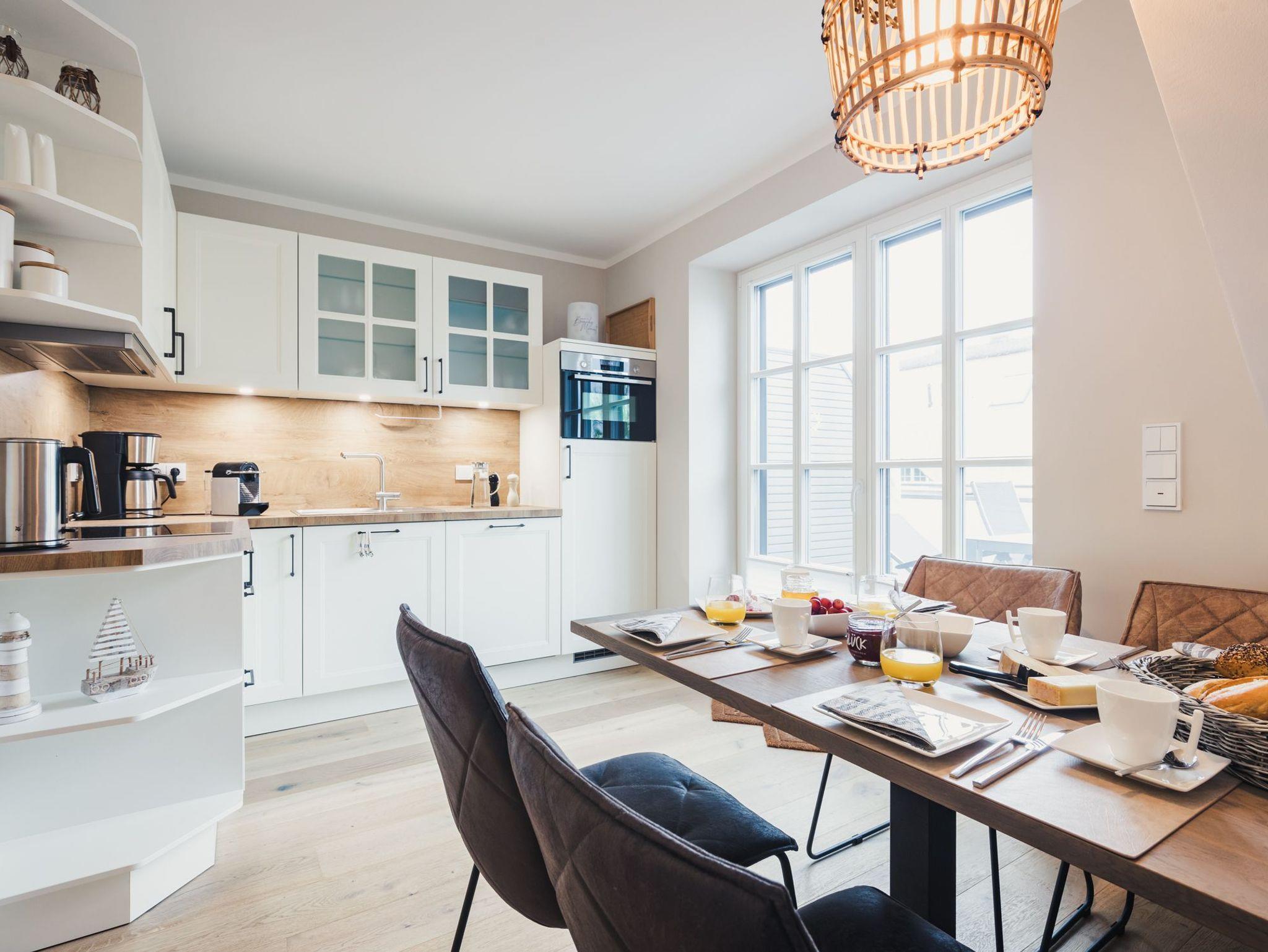 Die 56qm Wohnfläche verteilen sich auf zwei Etagen und bieten bis zu 4 Personen jeglichen Komfort für einen erholsamen Urlaub. Der großzügige, hochwertig eingerichtete Wohnbereich mit integrierter, moderner, voll ausgestatteter Küche und gemütlichem Essbereich lädt zum Wohlfühlen ein. Der lichtdurchflutete Wohnbereich verfügt zudem über einen Gaskamin und direktem Zugang zum sonnigen Balkon. Von hier aus können Sie spektakuläre Sonnenuntergänge mit einem Glas Wein genießen.