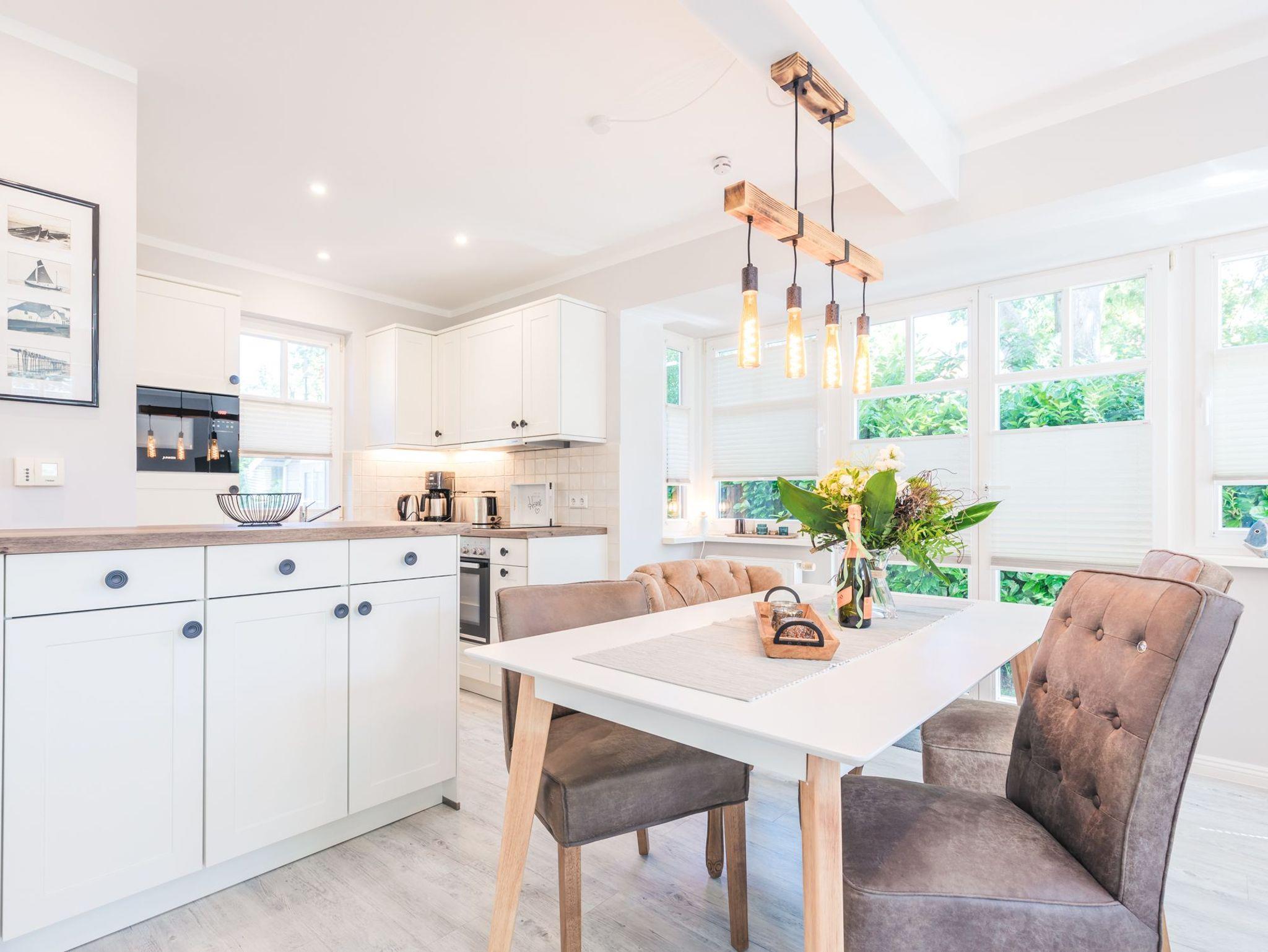 Über eine breite komfortable Treppe erreichen Sie die obere Etage mit zwei behaglichen Schlafzimmern. Das größere von beiden ist mit einem komfortablen Doppelbett, einem großzügigen Kleiderschrank sowie einen schwenkbaren Smart-TV ausgestattet. Das zweite Schlafzimmer besticht mit seinem maritimen Flair. Ein großes Dachfenster lässt viel Licht in den Raum mit zwei Einzelbetten, einem Kleiderschrank, einem kleinem Sekretär und einem weiteren schwenkbaren Smart- TV.