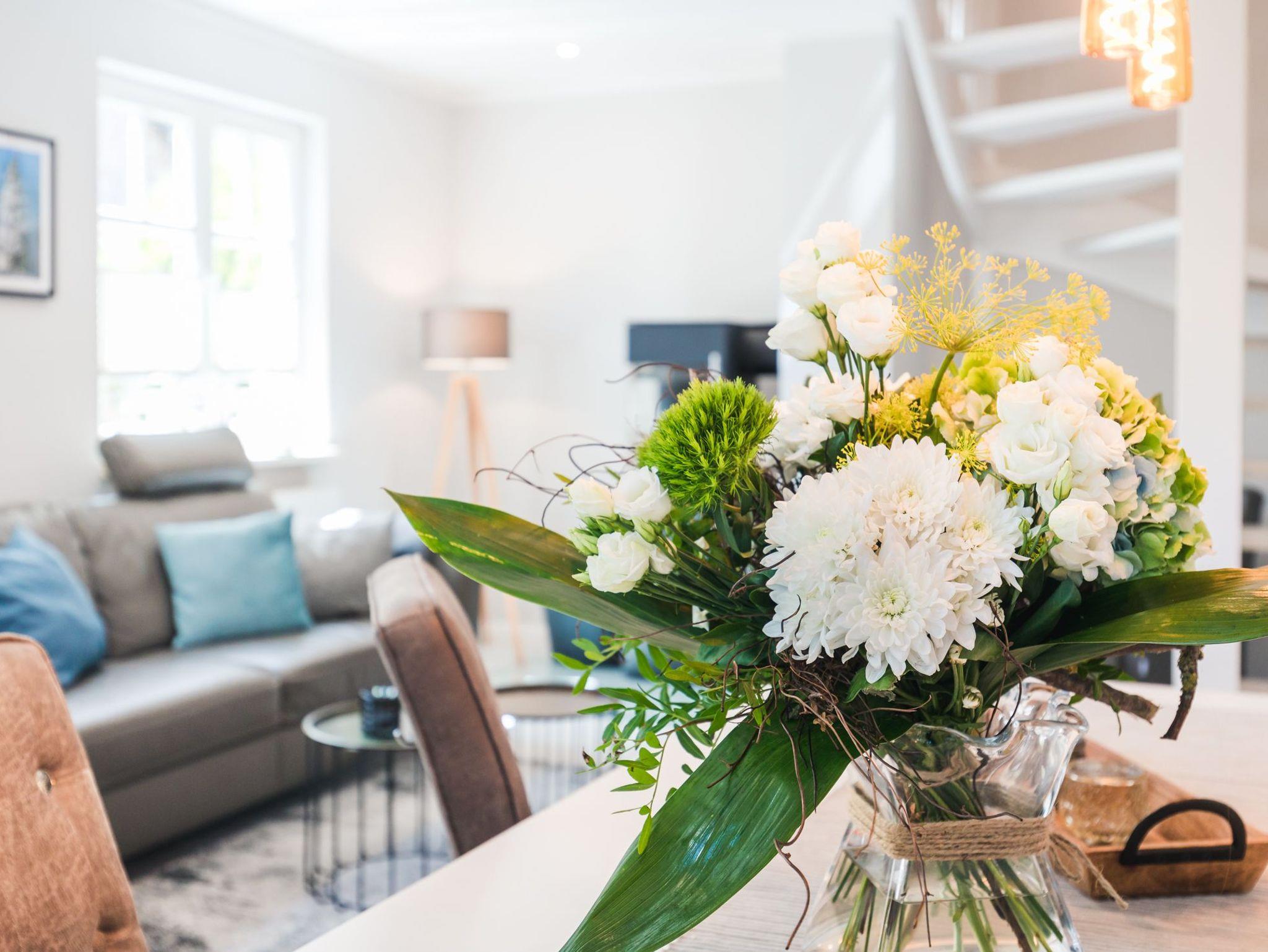 Im Erdgeschoß betreten Sie durch einen Flur mit Garderobe den offenen und großzügigen Wohn- /Eßbereich mit moderner Einbauküche. Eine umfassende Ausstattung bietet alles, was Sie für einen angenehmen Aufenthalt benötigen.