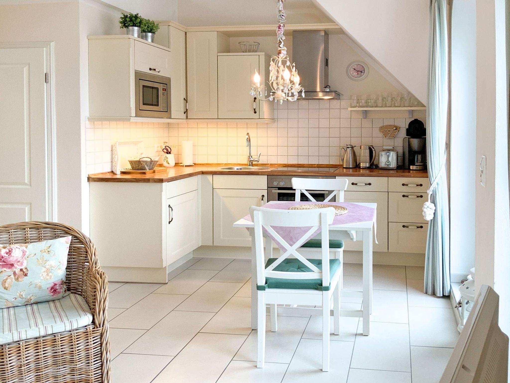 Die Ferienwohnung Rosenblüte empfängt Sie mit einer stilvollen und einladenden Atmosphäre. Der offene Wohn- und Essbereich ist geschmackvoll eingerichtet und bietet den perfekten Ort für entspannte Abende. Die voll ausgestattete Einbauküche verfügt über moderne Geräte wie Mikrowelle, Elektroherd mit Backofen und Ceranfeld sowie einen Geschirrspüler, sodass Sie mühelos kulinarische Köstlichkeiten zubereiten können.