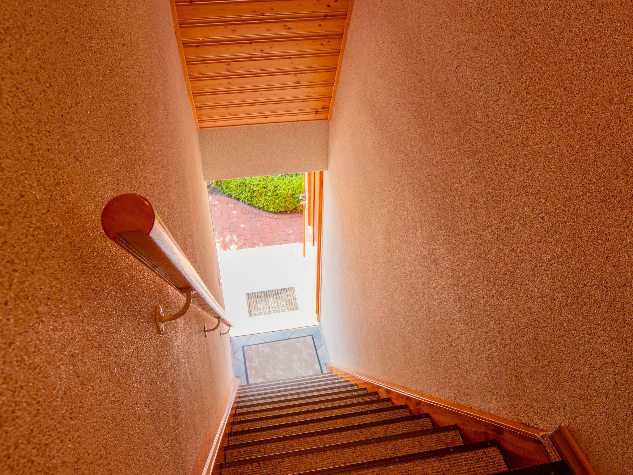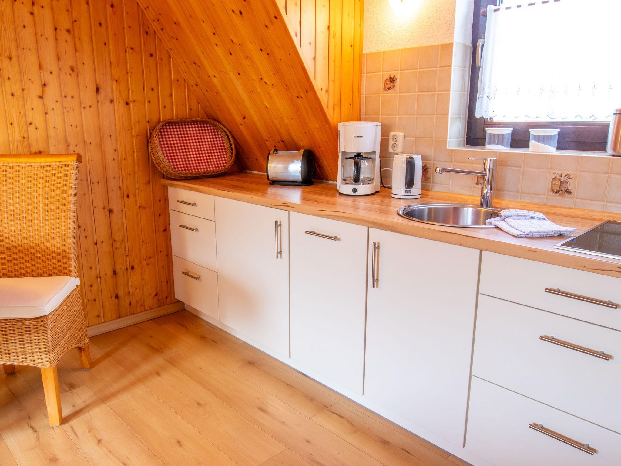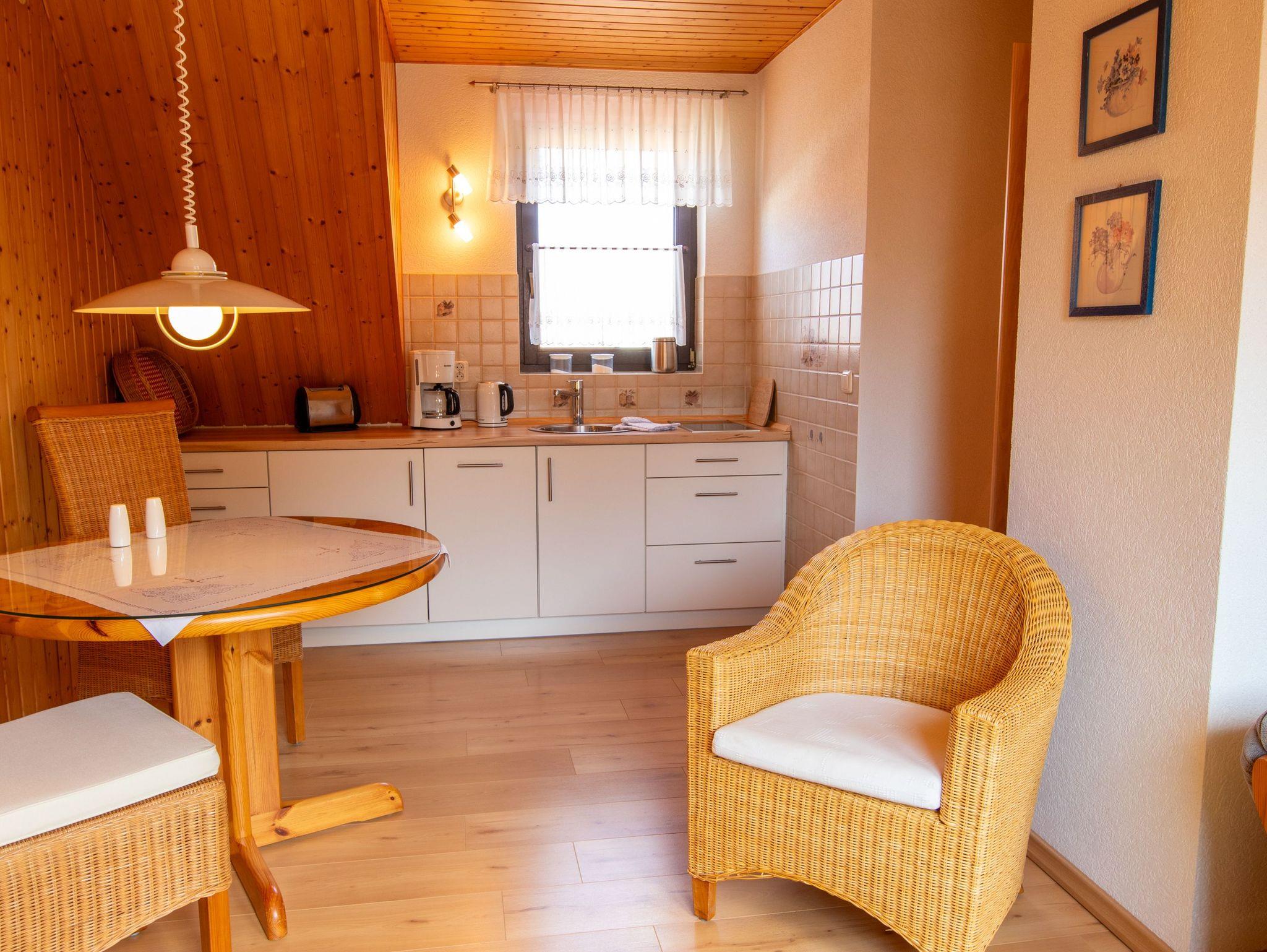 Die Ferienwohnung 2 befindet sich im Obergeschoss des Hauses der Vermieter. Sie ist über einen separaten Eingang und eine steile Treppe zu erreichen. Auf der einen Seite finden sie ein großes Schlafzimmer mit Doppelbett (180x200) und Bad mit Dusche und WC. Auf der anderen Seite liegt das Wohnzimmer mit TV, offener Küche und Essbereich. Die Küche ist mit einem 2-Platten-Kochfeld, Kühlschrank, Spülmaschine, Kaffeemaschine, Toaster, Wasserkocher und Kochutensilien ausgestattet