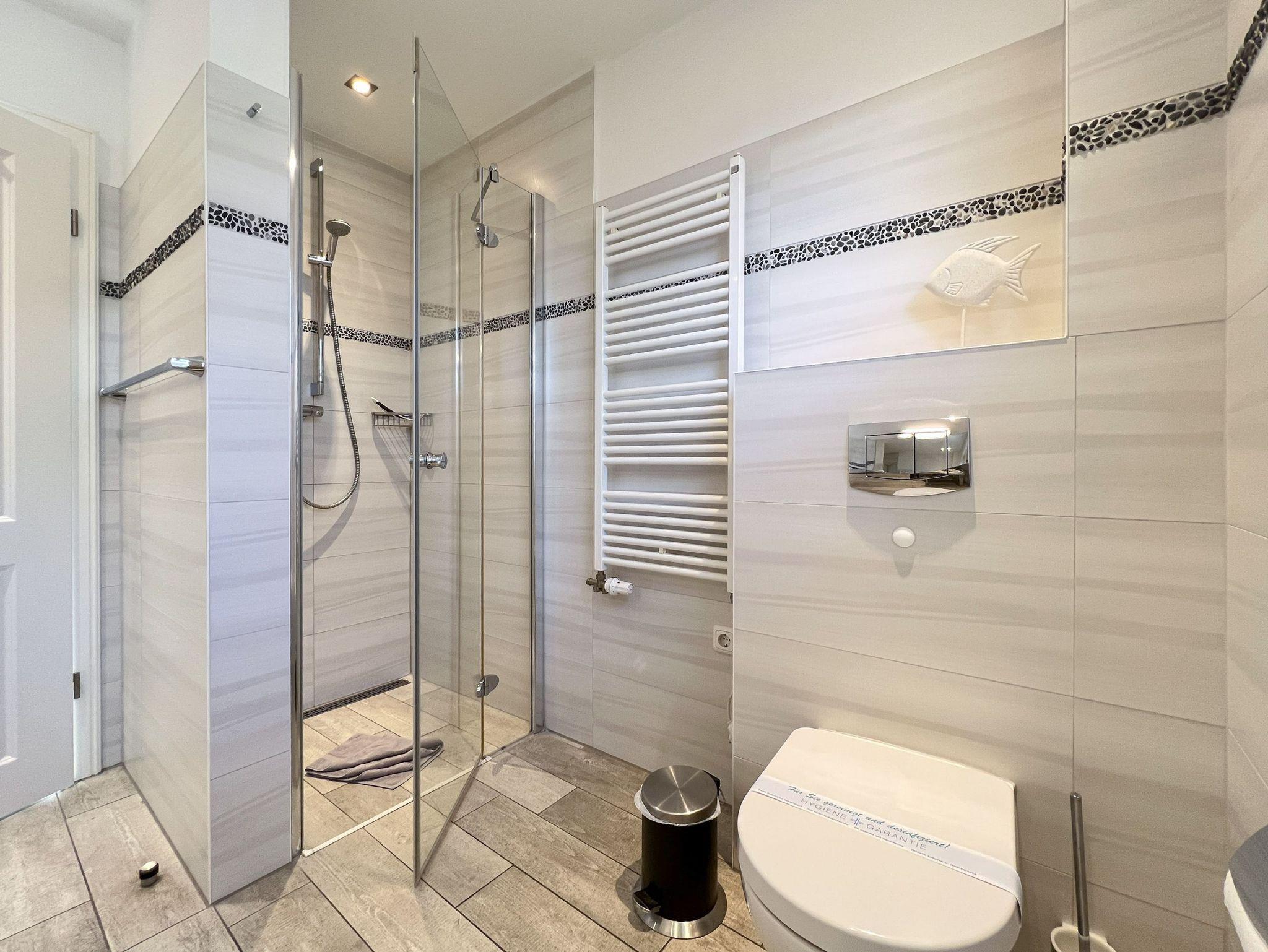 • Badezimmer: Zwei moderne Bäder mit bodentiefer Dusche, Fußbodenheizung und Haartrockner