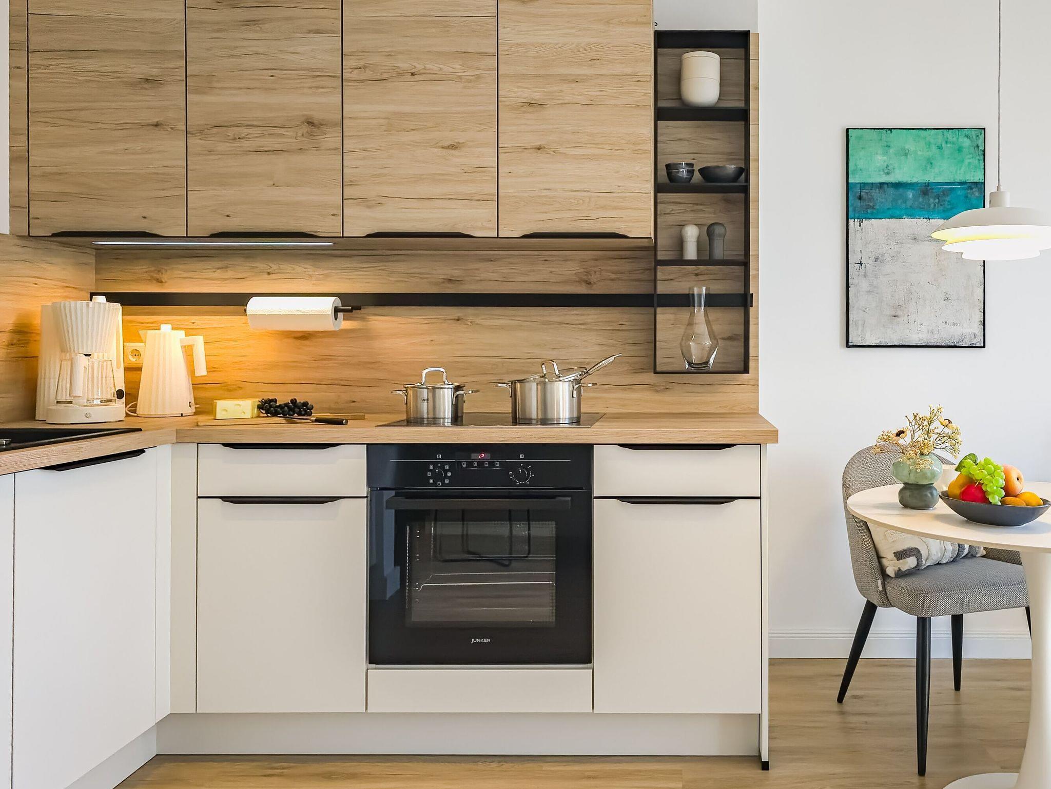 • Moderne Küchenzeile mit Spülmaschine, Backofen, Kochfeld, Kühlschrank mit Gefrierfach, Kapsel- [&] Filterkaffeemaschine, Toaster, Wasserkocher