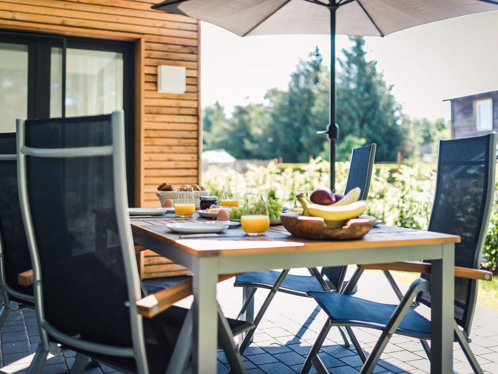 Auf der sonnigen Süd-Terrasse können Sie auf bequemen Gartenmöbeln den Tag ausklingen lassen oder sich das Frühstück schmecken lassen.