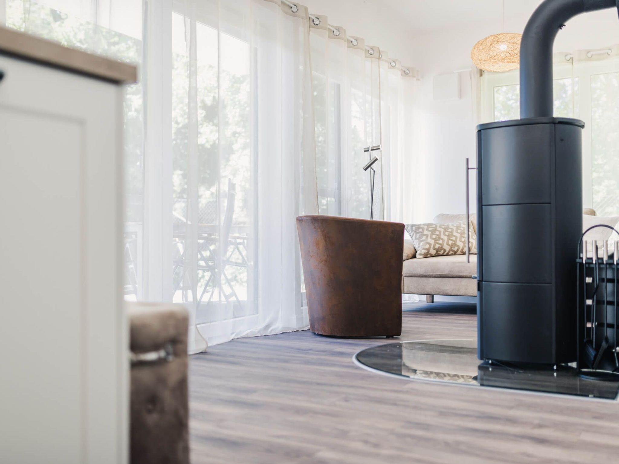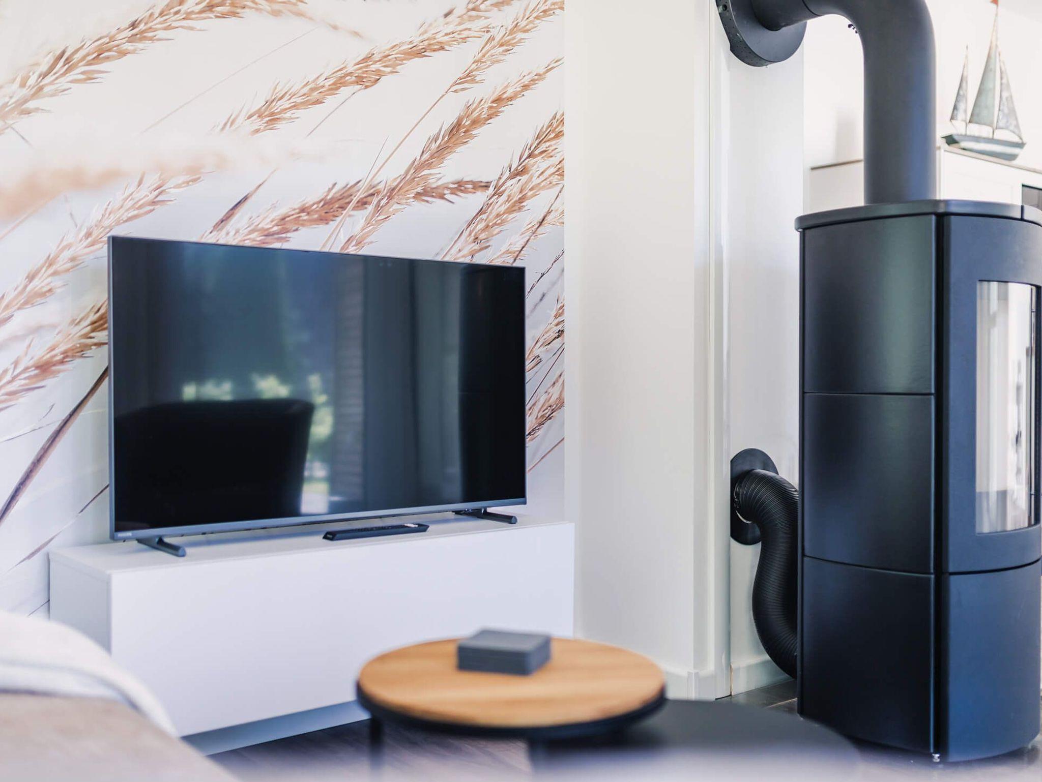 Im behaglichen Wohnbereich spendet ein Kamin an kühlen Abenden oder nach einer langen Fahrradtour Gemütlichkeit und wohlige Wärme. Ein Flachbildfernseher für Ihre Unterhaltung und ein Esstisch runden den Wohn- und Essbereich ab.