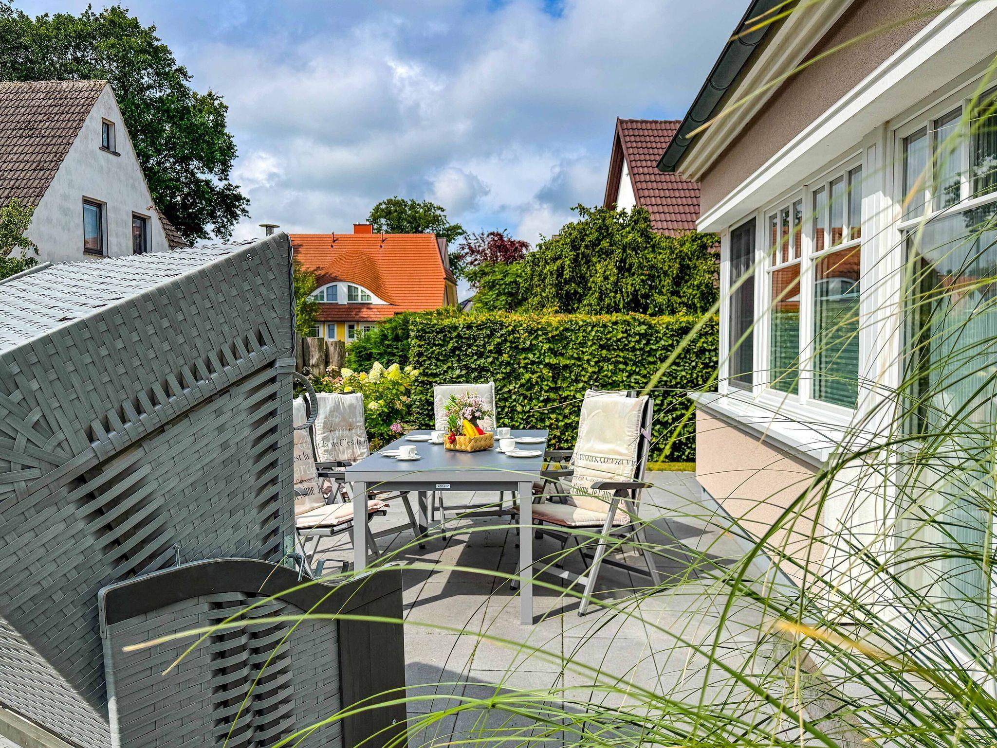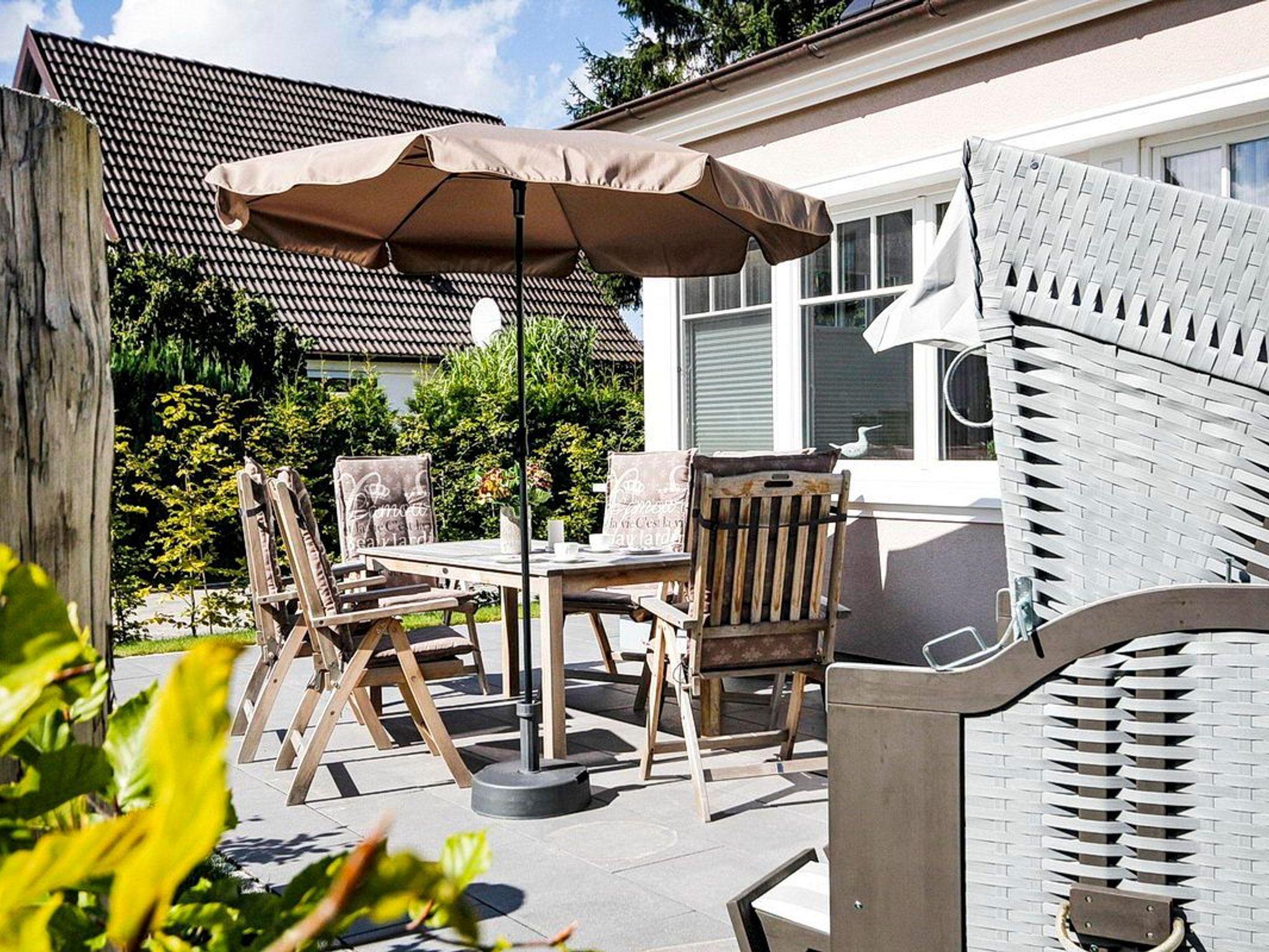 Die Terrasse mit eigenem Strandkorb bietet sonnige Ruheplätze, während der Garten Raum für Entspannung und gemeinsame Momente schafft.