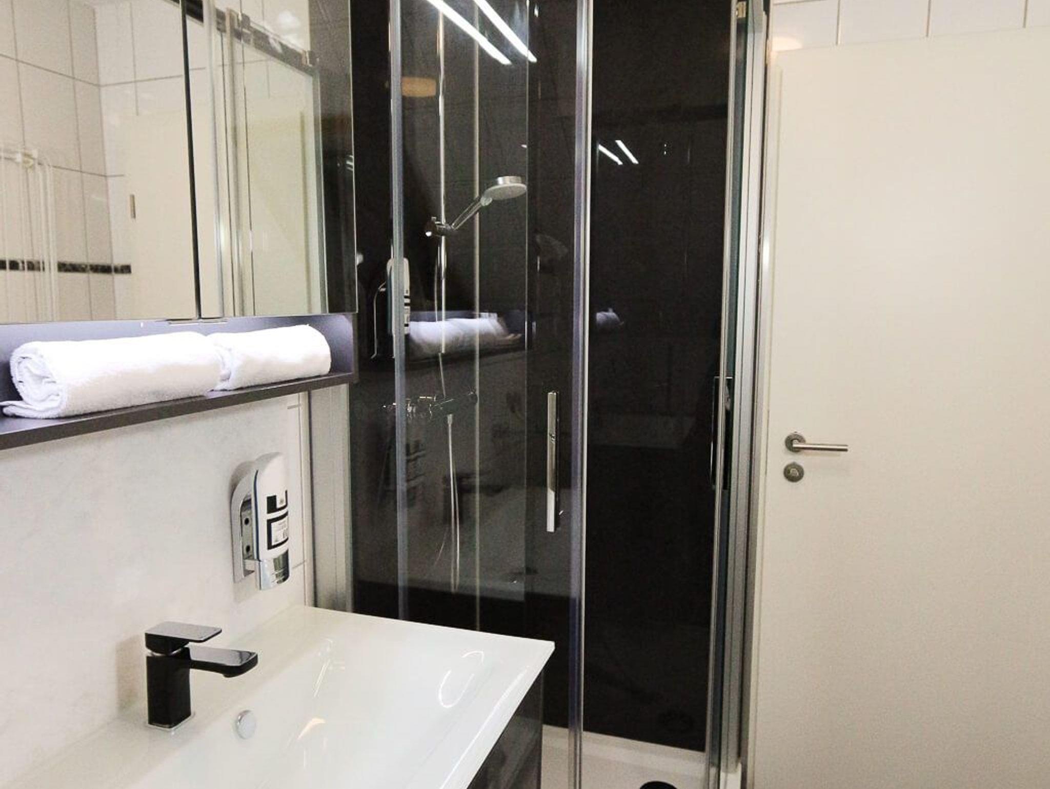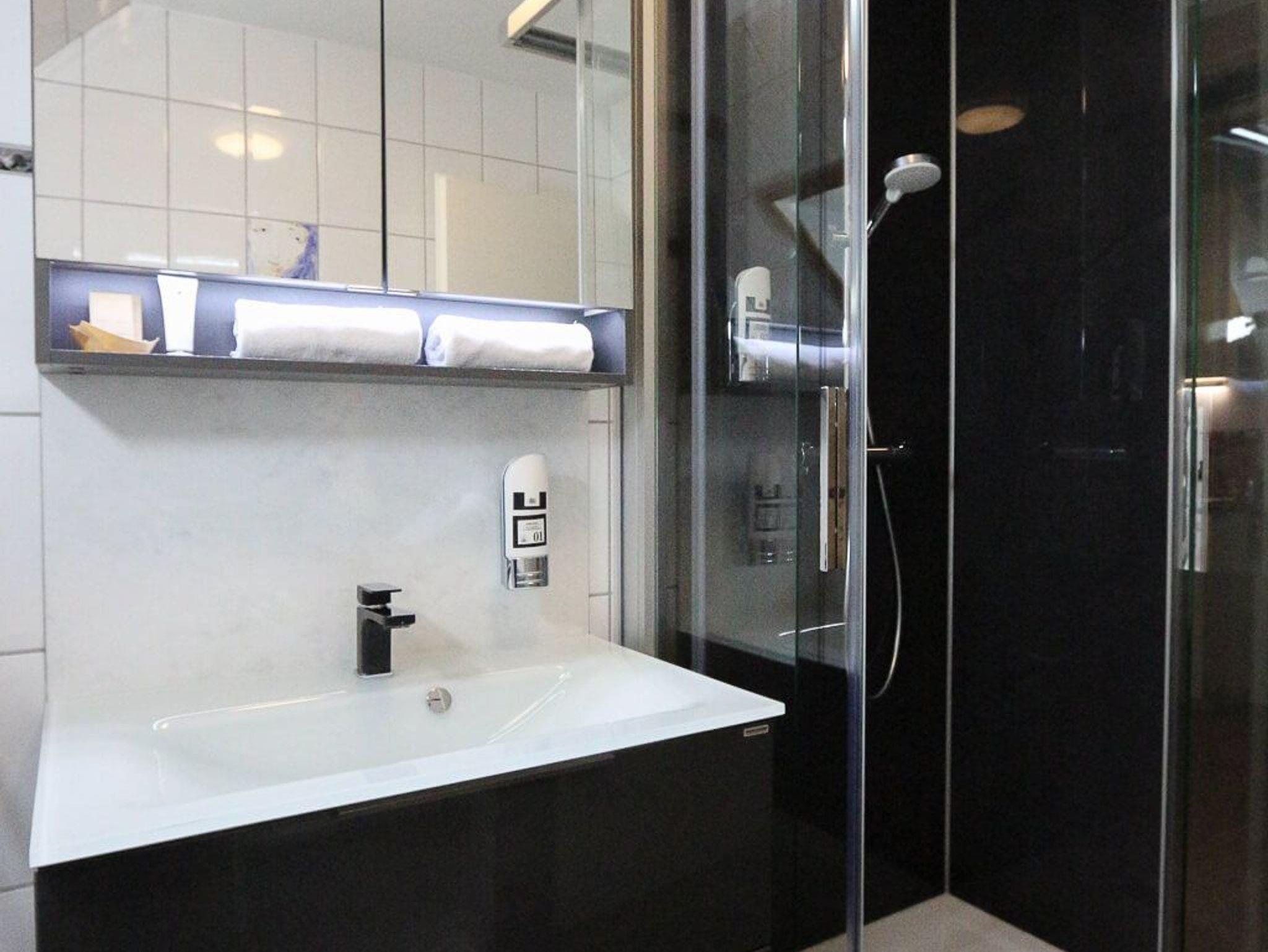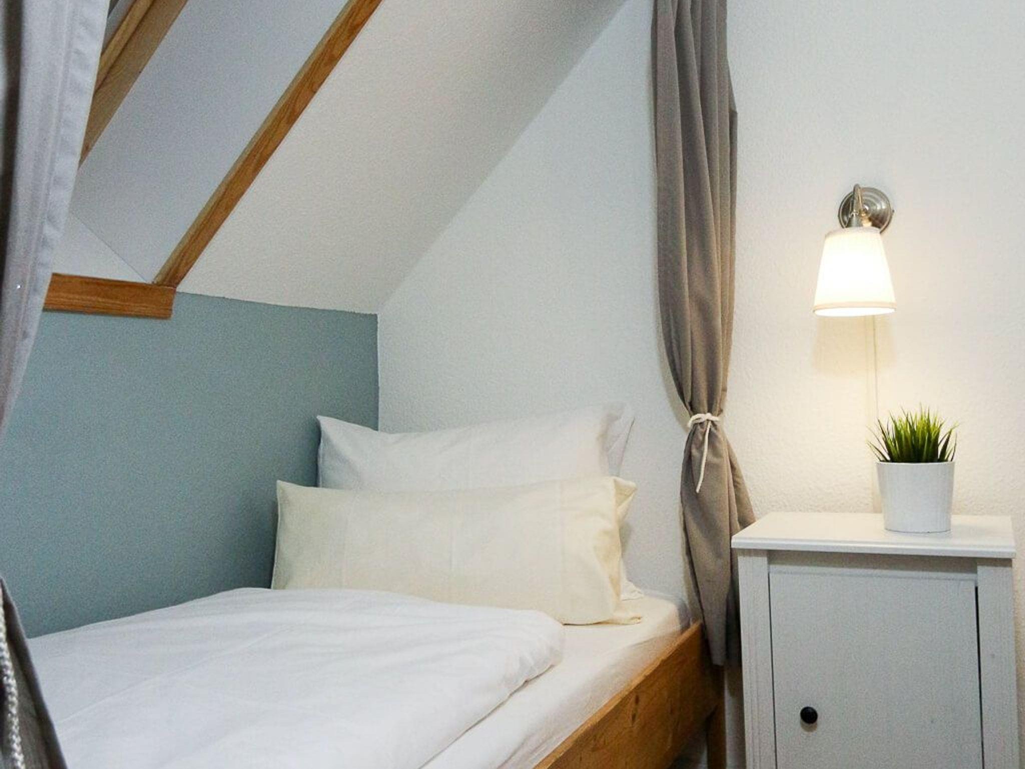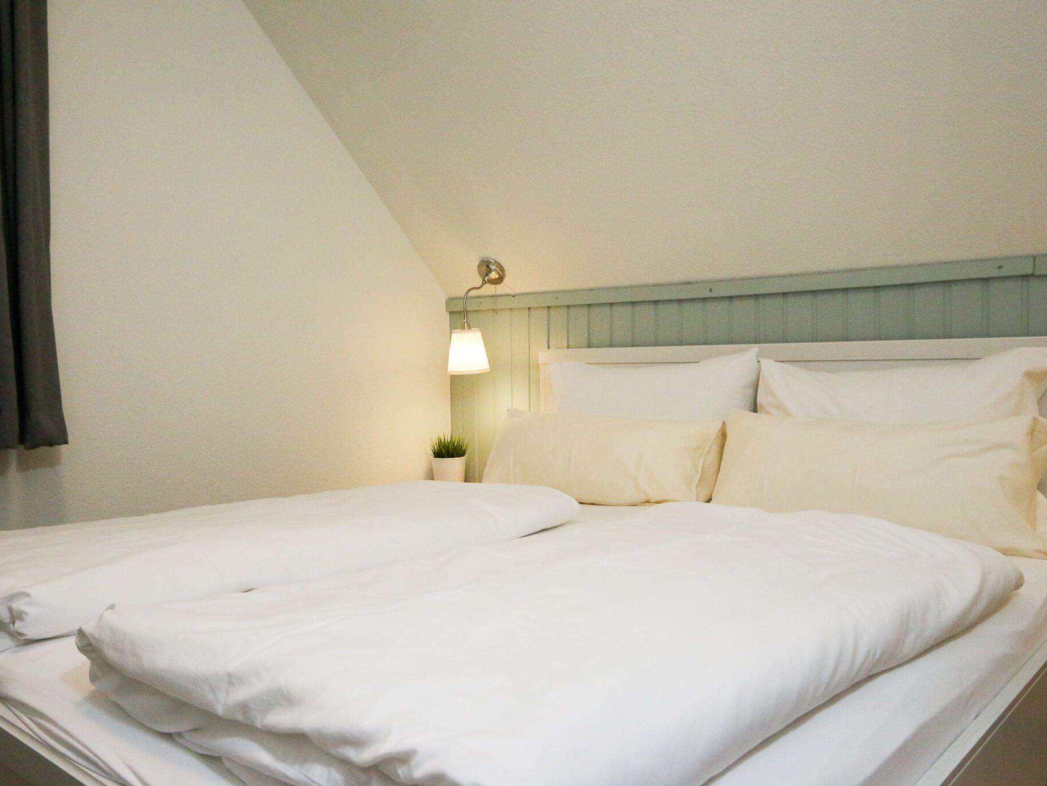 Das Badezimmer ist mit Dusche, WC, Föhn und Pflegeprodukten ausgestattet. Über die Innentreppe gelangen Sie in den Schlafbereich mit Doppelbett (160 × 200 cm, getrennte Matratzen) sowie in eine separate Schlafkoje (ca. 1,85 m Länge). WLAN, Bettwäsche und Handtücher sind inklusive. Nichtraucher-Apartment, geeignet für Paare mit Kind oder kleine Familien.