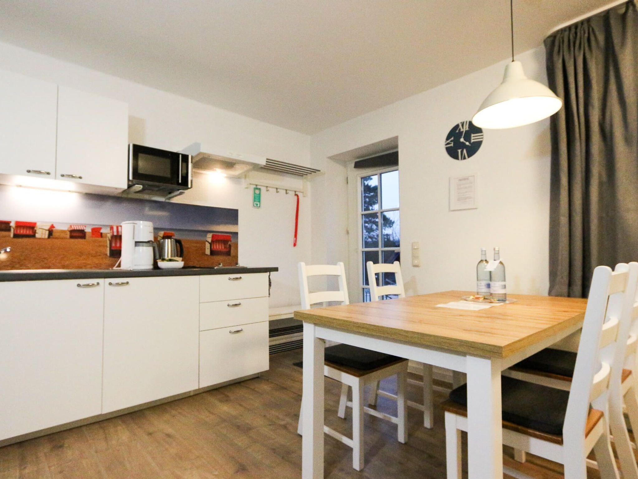 Das Apartment Helling ist ein Maisonette-Apartment im Obergeschoss von Haus 3 der Ferienanlage Captain Pahlen in Zingst. Die Unterkunft erstreckt sich über zwei Ebenen und bietet eine wohnliche Atmosphäre mit maritimen Akzenten. Im unteren Bereich befinden sich der Wohnraum mit Sitzgelegenheit, ein Essplatz sowie eine Küchenzeile mit Ceranfeld, Kühlschrank mit Gefrierfach, Mikrowelle mit Grillfunktion, Wasserkocher, Toaster und Kaffeemaschine.