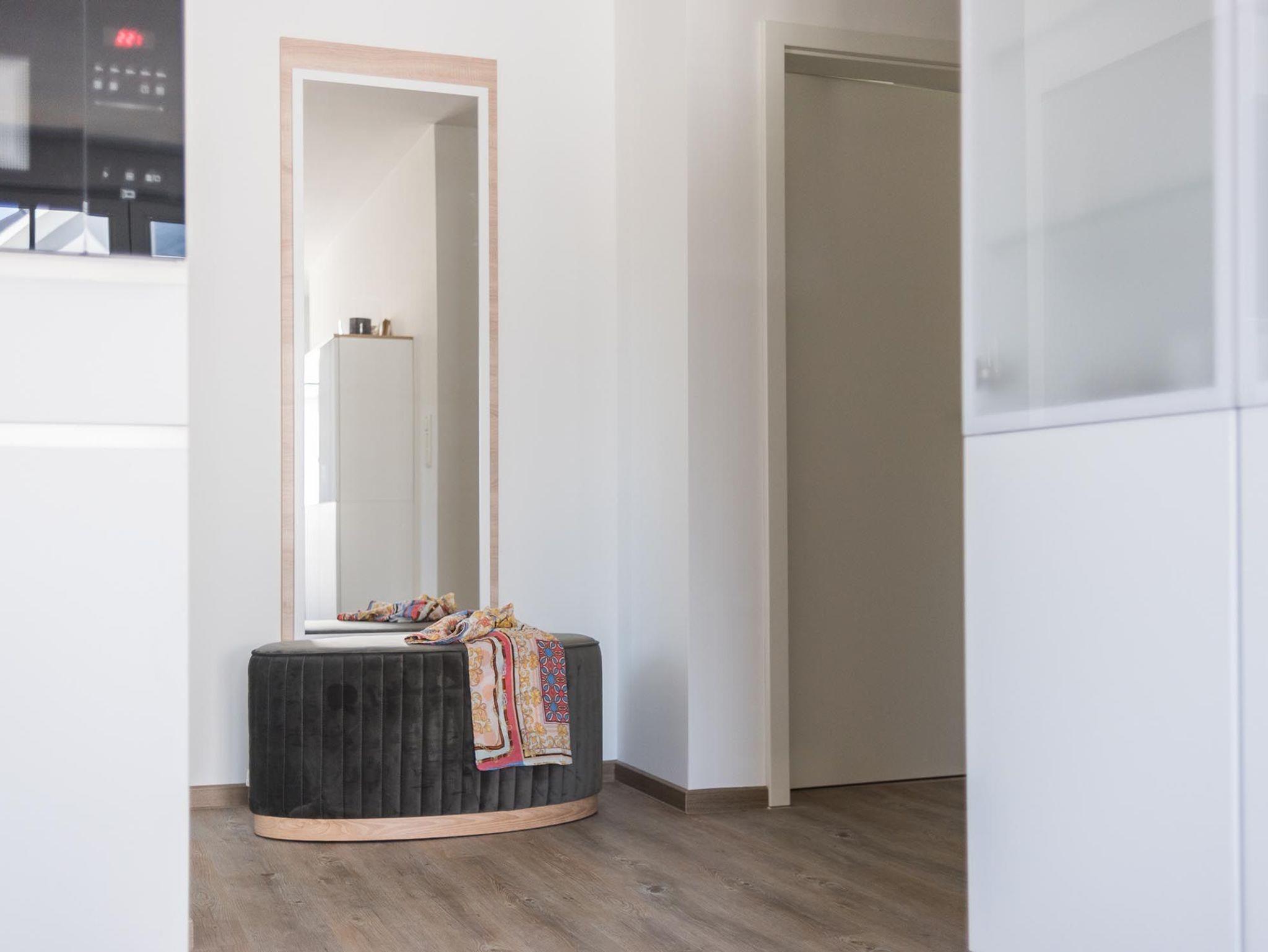 Das modern eingerichtete Badezimmer ist mit einer hochwertigen Dusche sowie einer Waschmaschine ausgestattet.
