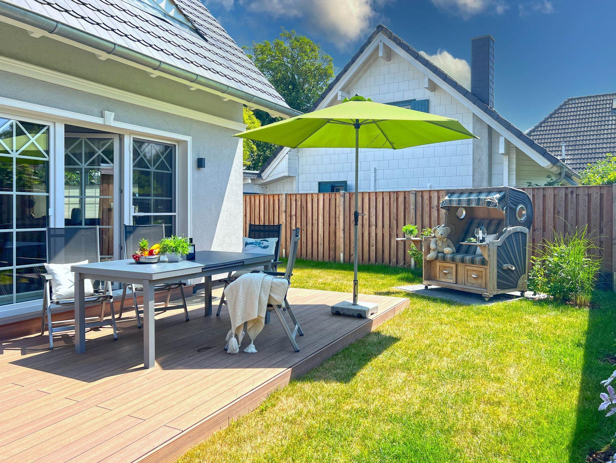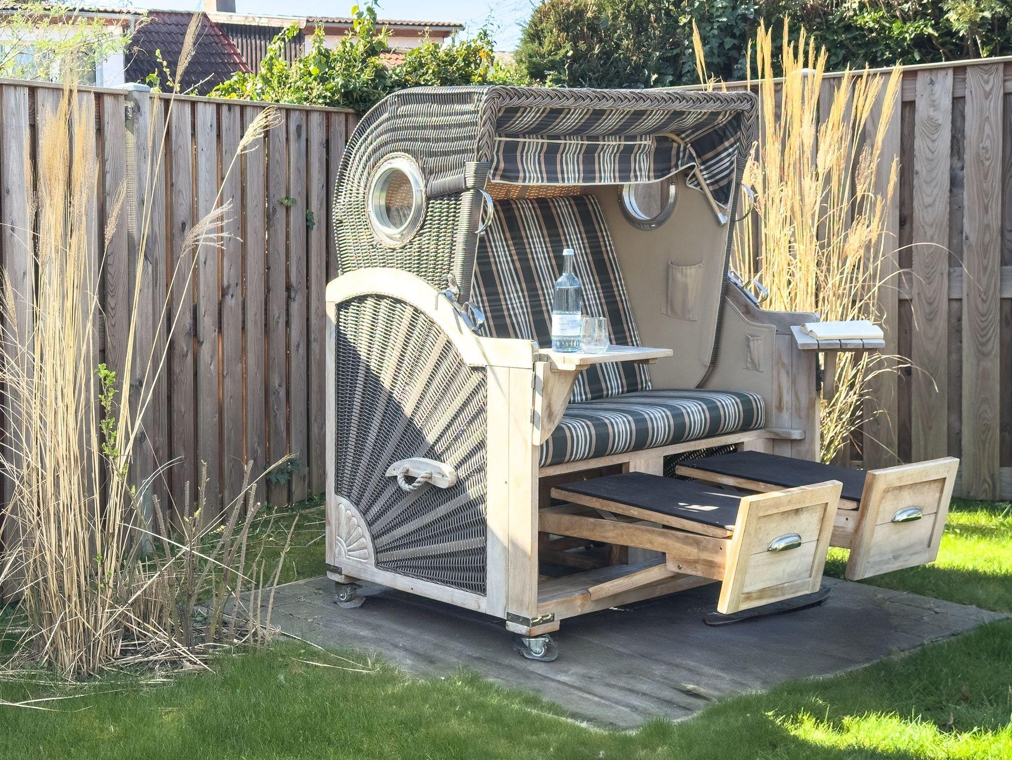 • Schöner Garten mit Terrasse: Gartenmöbel und Strandkorb für entspannte Stunden im Freien.