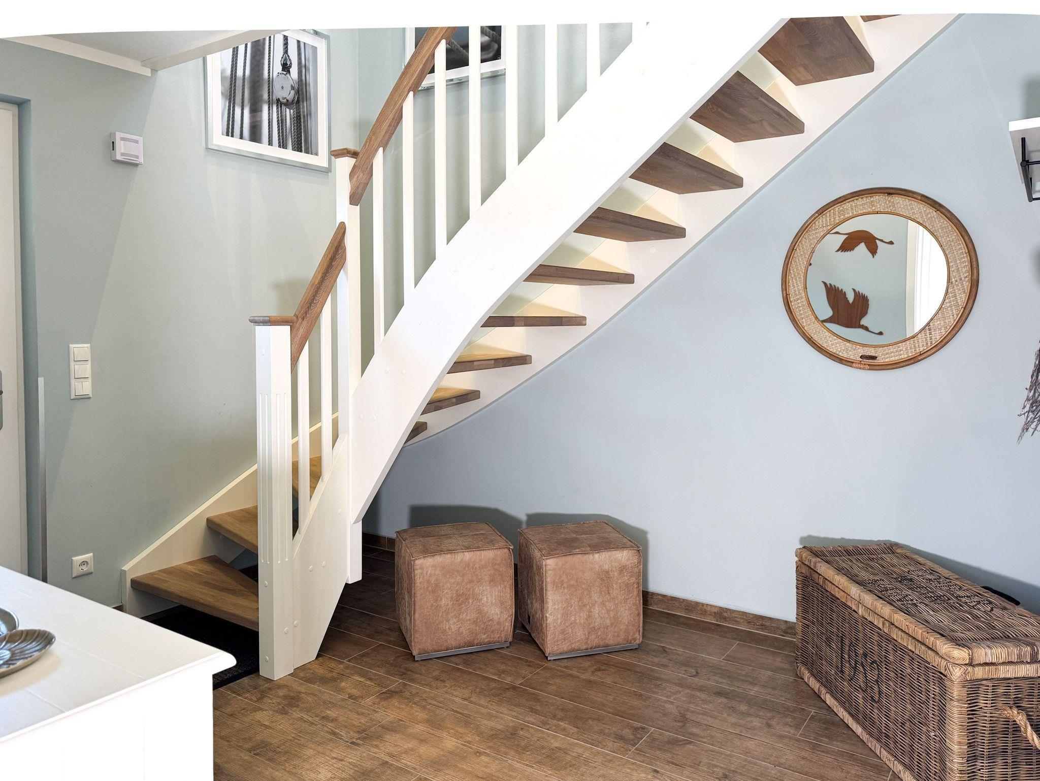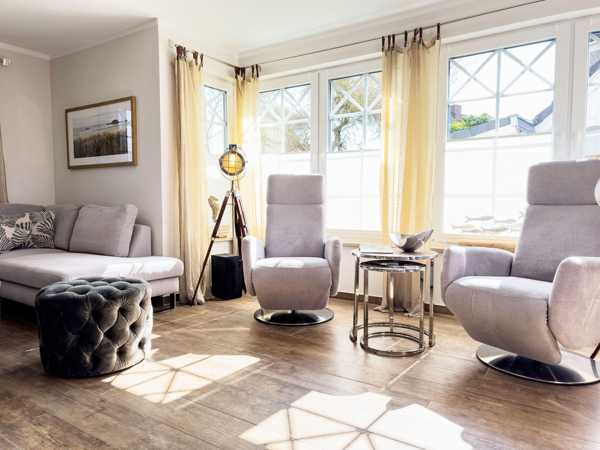 Genießen Sie wohltuende Wärme in der kostenfreien Sauna oder lassen Sie den Tag auf der sonnigen Terrasse im Strandkorb ausklingen. Die Badezimmer mit modernen Annehmlichkeiten sorgen für zusätzlichen Komfort, während der Waschtrockner im Hauswirtschaftsraum Ihren Aufenthalt erleichtert.