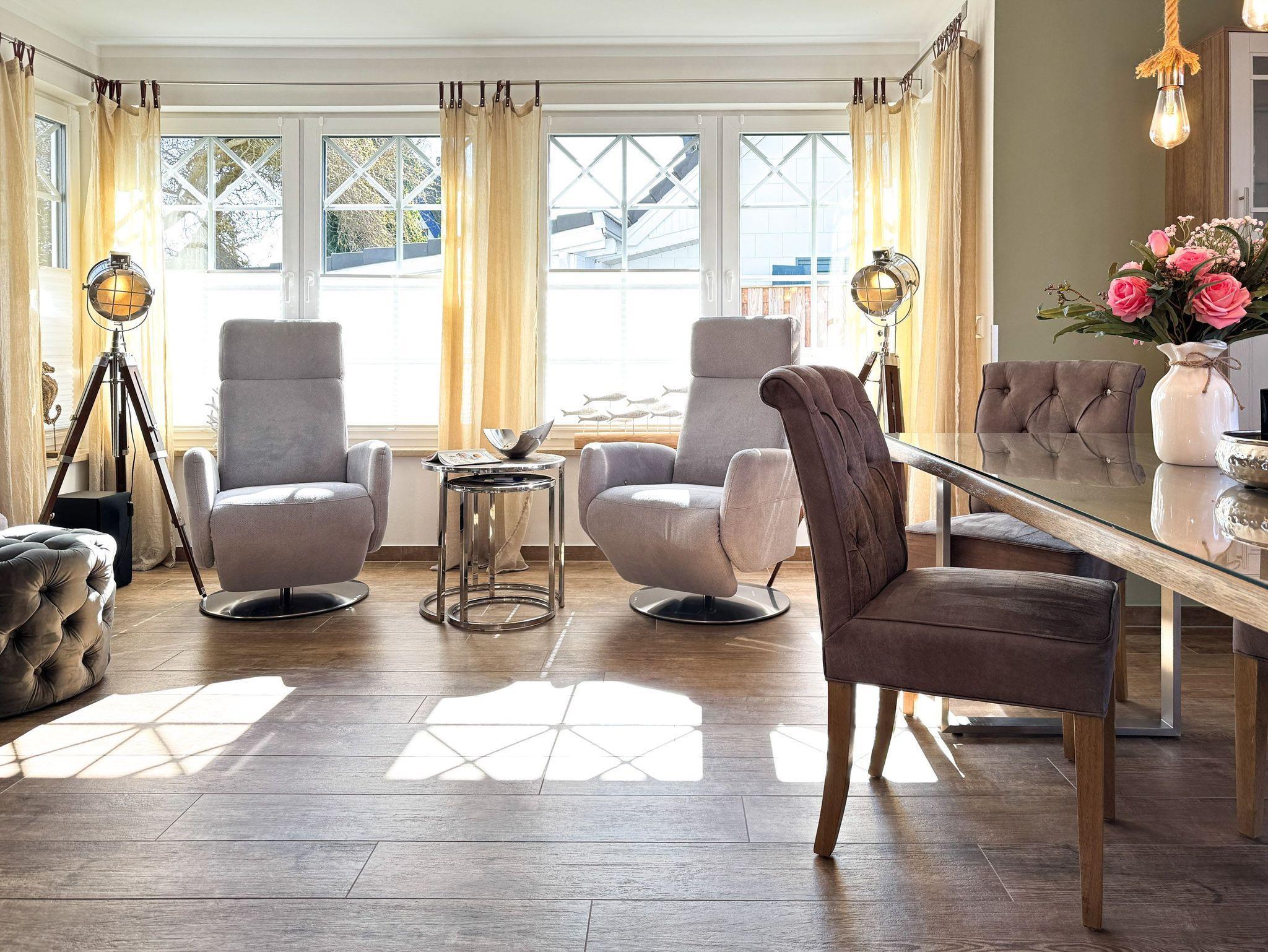 • Wohnzimmer mit Kamin: Bequeme Relaxsessel, komfortable Couch und ein großer TV für entspannte Abende.