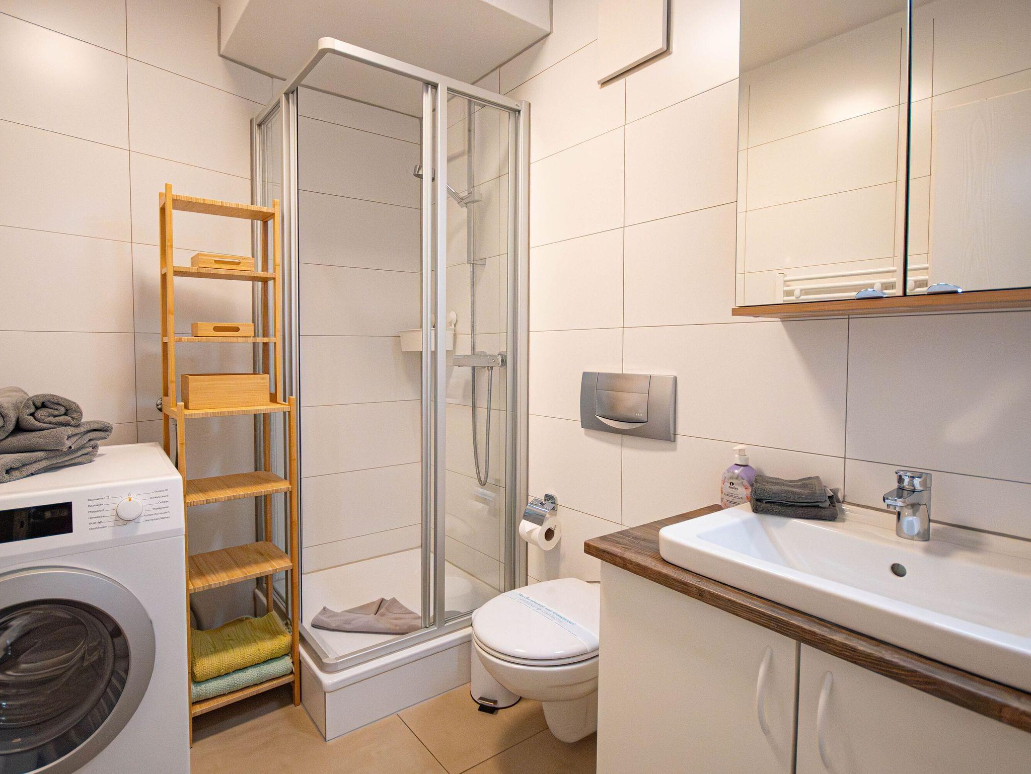• Badezimmer: Modernes Bad mit Dusche und Waschmaschine für zusätzlichen Komfort.