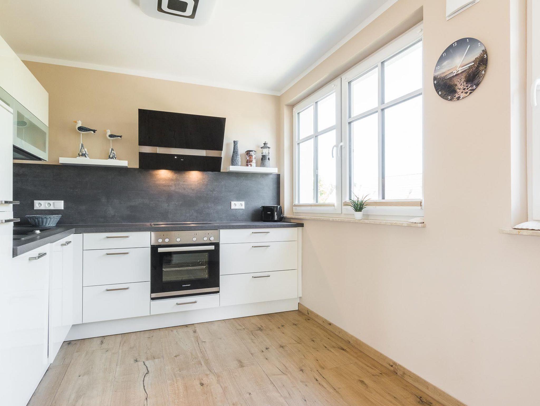 Das Appartement verfügt über einen großen lichtdurchfluteten Wohnbereich mit einer offenen Küche und gemütlichem Essbereich. Die Küche ist voll ausgestattet.