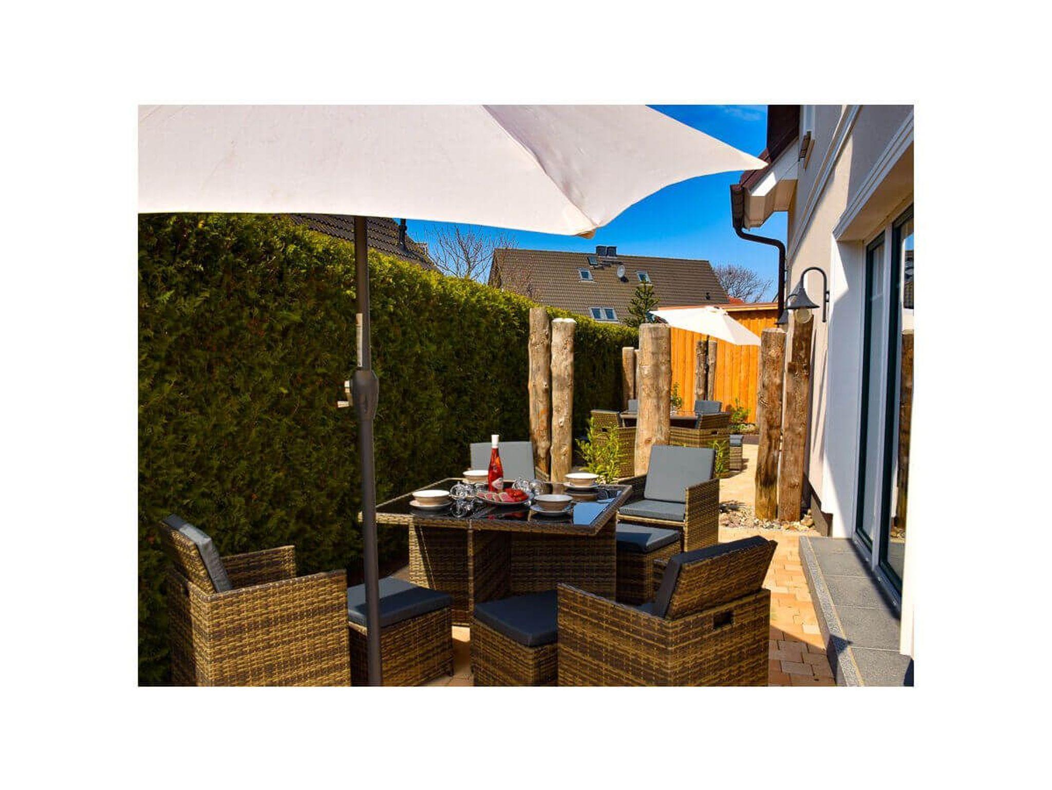 Die gemütliche Doppelhaushälfte Yvette 1 in Zingst bietet modernen Komfort, Kamin und Terrasse für einen entspannten Ostseeurlaub.