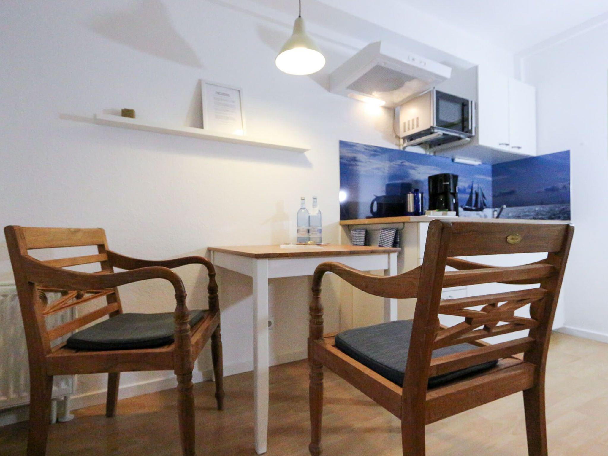 Das Apartment Kompass Nord ist ein ebenerdiges Terrassen-Apartment im Haus 3 der Ferienanlage Captain Pahlen in Zingst. Die Wohnung überzeugt durch eine freundliche, helle Gestaltung und eine klare Raumaufteilung. Der Wohnraum verfügt über einen Essplatz, eine Sitzgelegenheit sowie eine funktionale Küchenzeile mit Ceranfeld, Kühlschrank mit Gefrierfach, Mikrowelle mit Grillfunktion, Toaster, Wasserkocher und Kaffeemaschine.