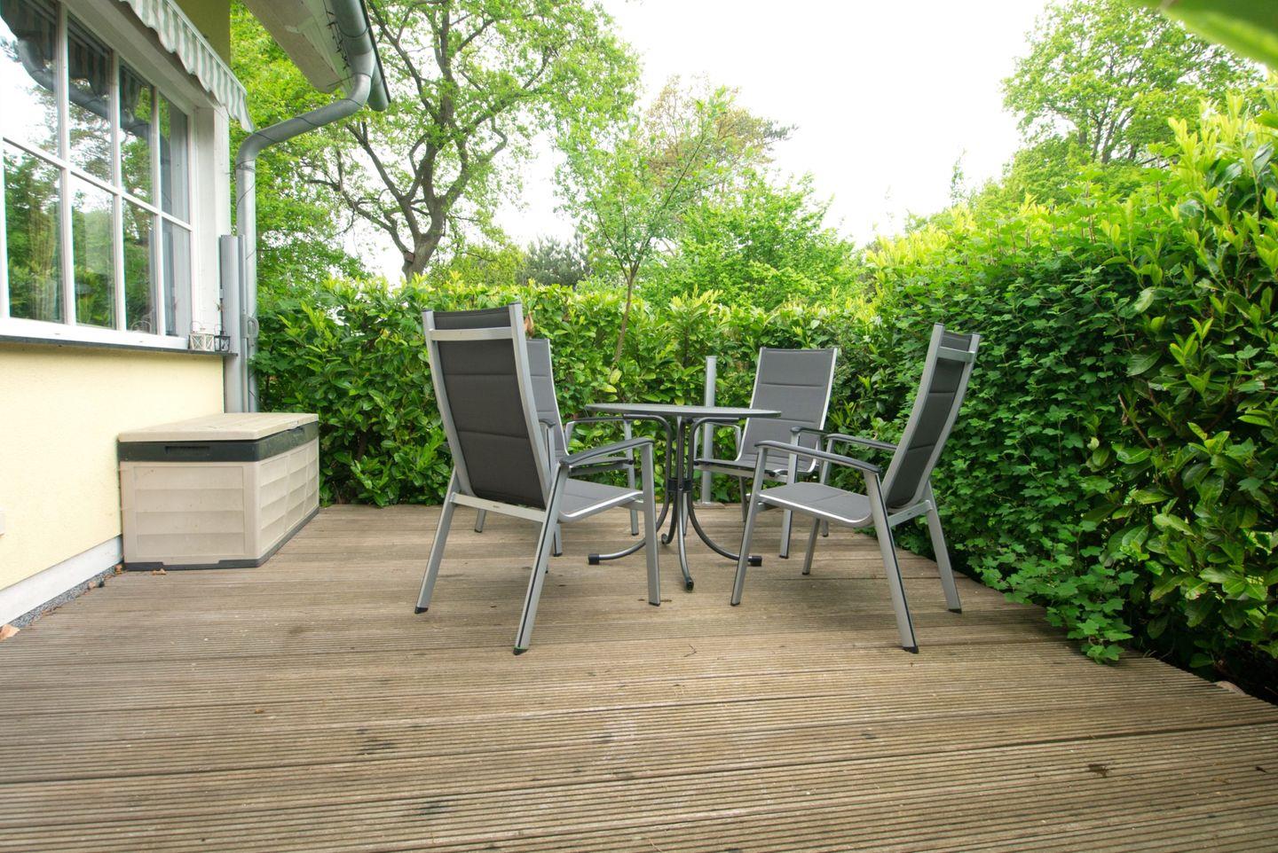 Der begrünte Außenbereich verfügt über eine sichtgeschützte Holzterasse, die an das Wohnzimmer grenzt. Ein Schuppen auf dem Grundstück bietet Fahrrädern eine sichere Unterstellmöglichkeit.