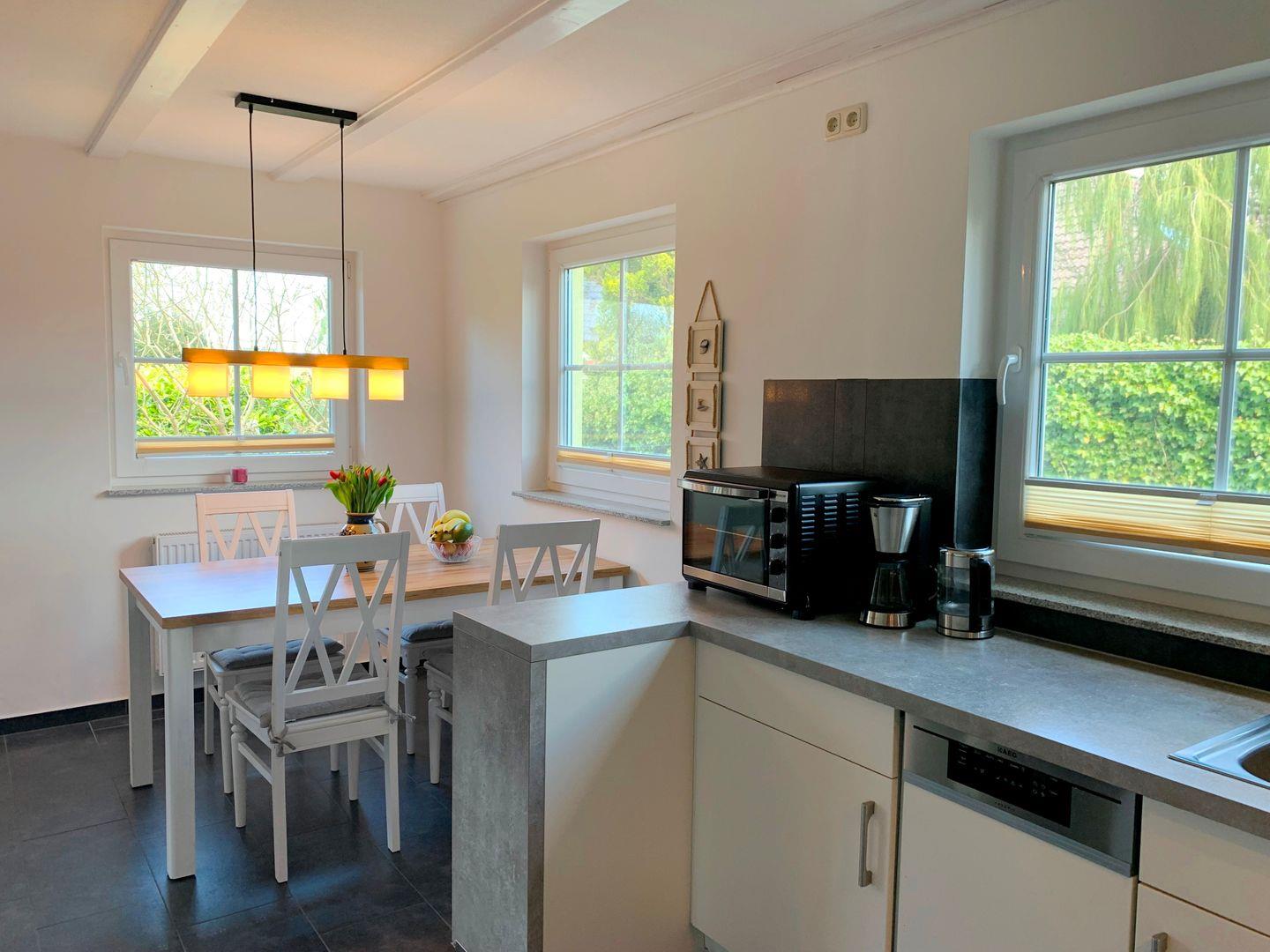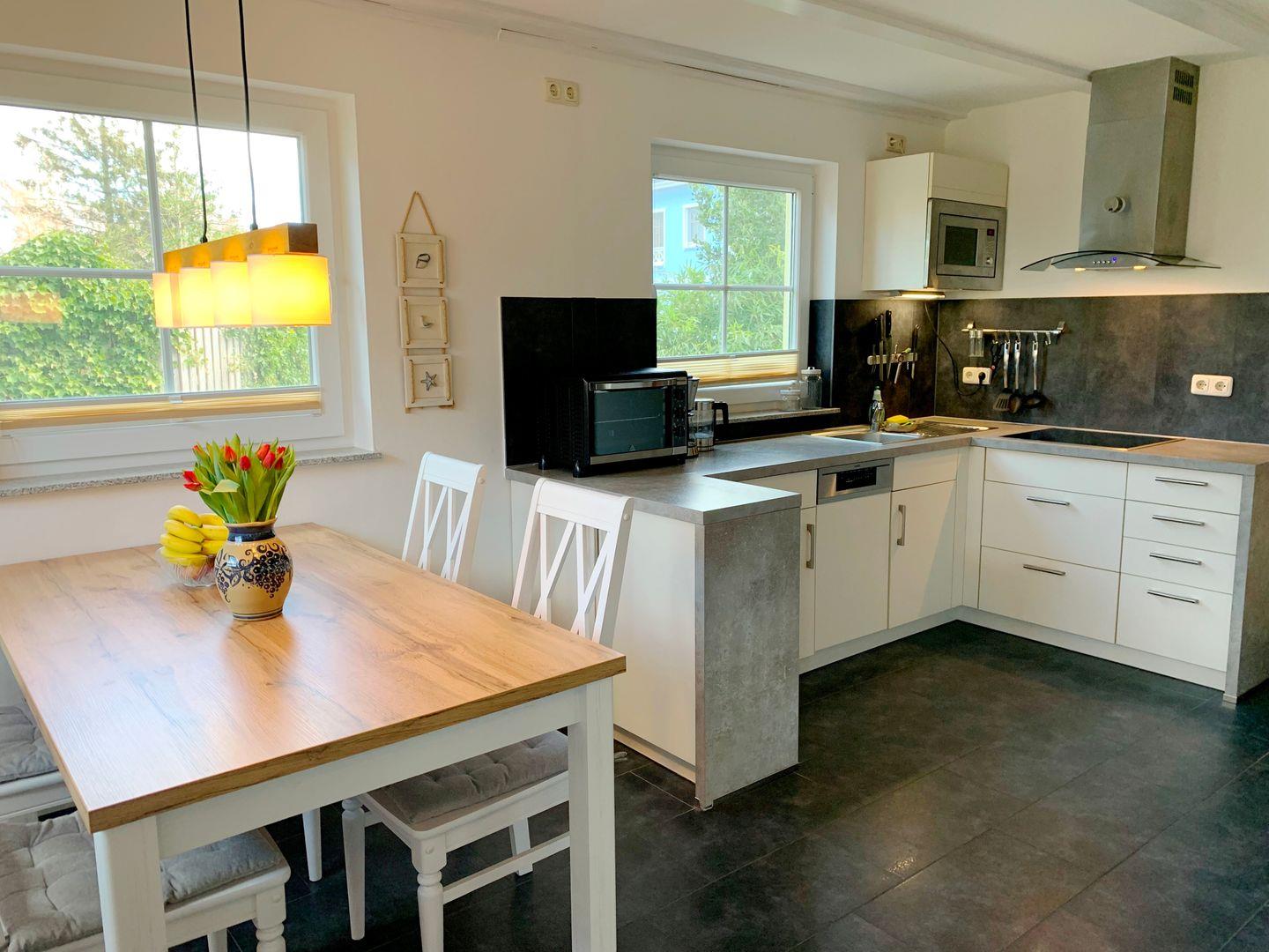 Die im Wohnbereich integrierte Küche verfügt über Minibackofen, Geschirrspüler, Kochfeld mit Dunstabzugshaube sowie Kaffeemaschine und einer Mikrowelle.