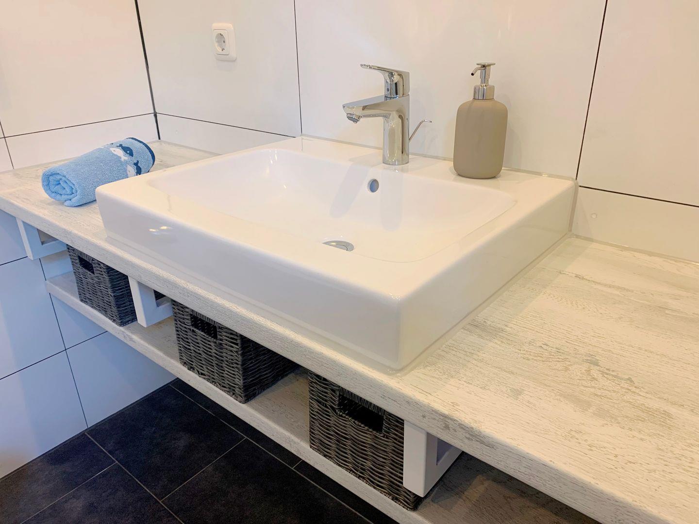 Das Badezimmer im Erdgeschoss verfügt über eine große Regendusche, die nach einem ausgedehnten Strandtag für Entspannung sorgt.
