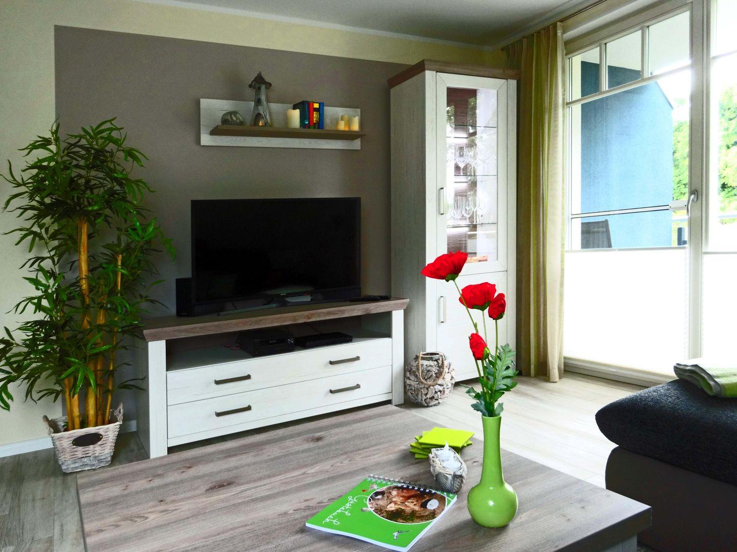 Das Apartment wurde 2017 fertiggestellt und eignet sich für 3 Personen. Es verfügt über ein Hauptschlafzimmer mit Boxspringbett, Einbauschrank und Sat-TV. Das zweite Schlafzimmer ist mit einem Ausziehbett, einem Kleiderschrank sowie Sat-TV und einem DVD-Player ausgestattet.