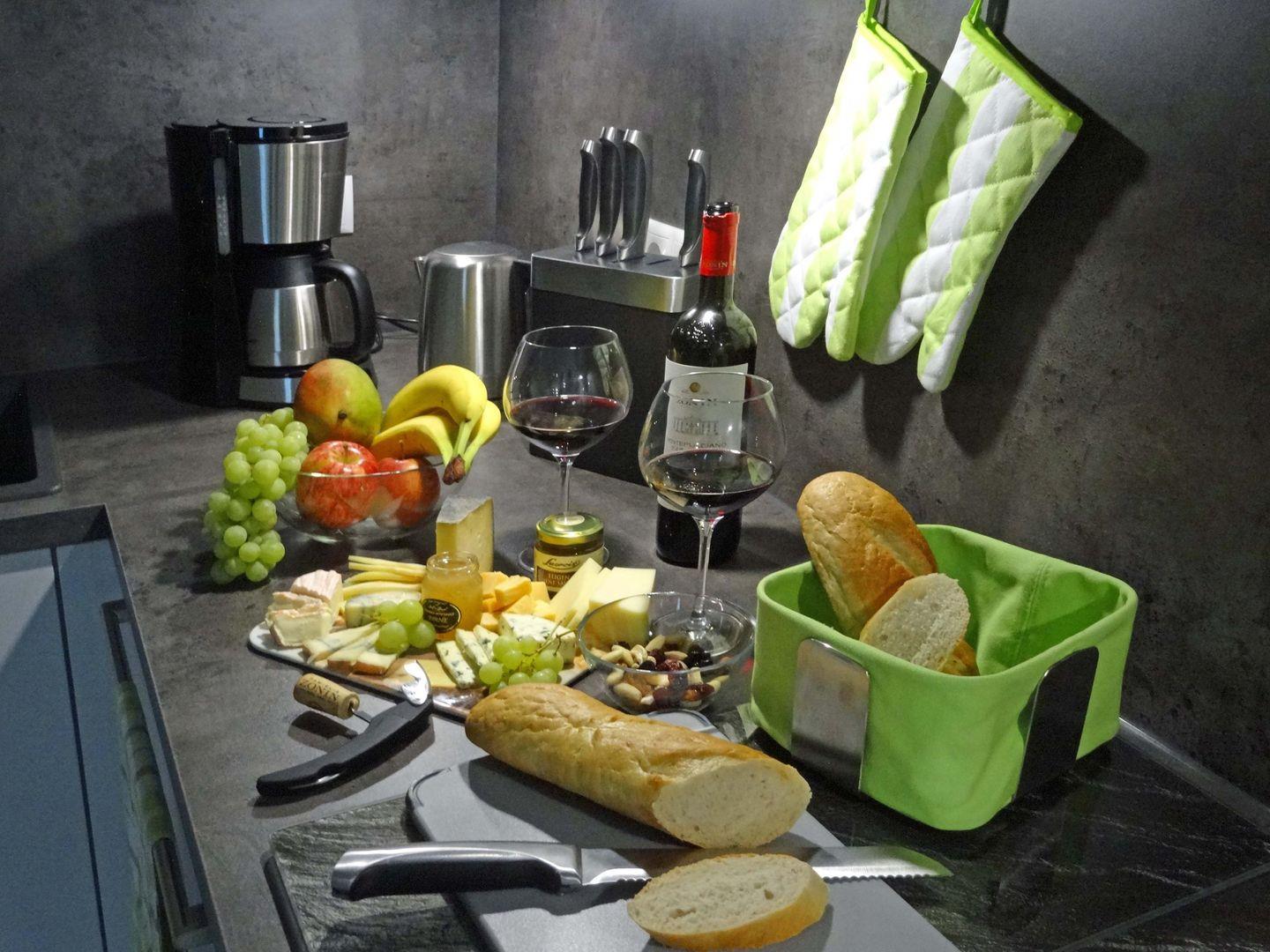 Ein großzügiger Wohn- und Essbereich mit Sofalandschaft, Blu-Ray-Player, SAT-TV und Stereoanlage sorgt für entspannte Abende. Die offene Küche ist umfassend eingerichtet: Cerankochfeld, Backofen, Mikrowelle, Geschirrspüler, Kühlschrank mit Gefrierfach und Kaffeemaschine sind vorhanden.