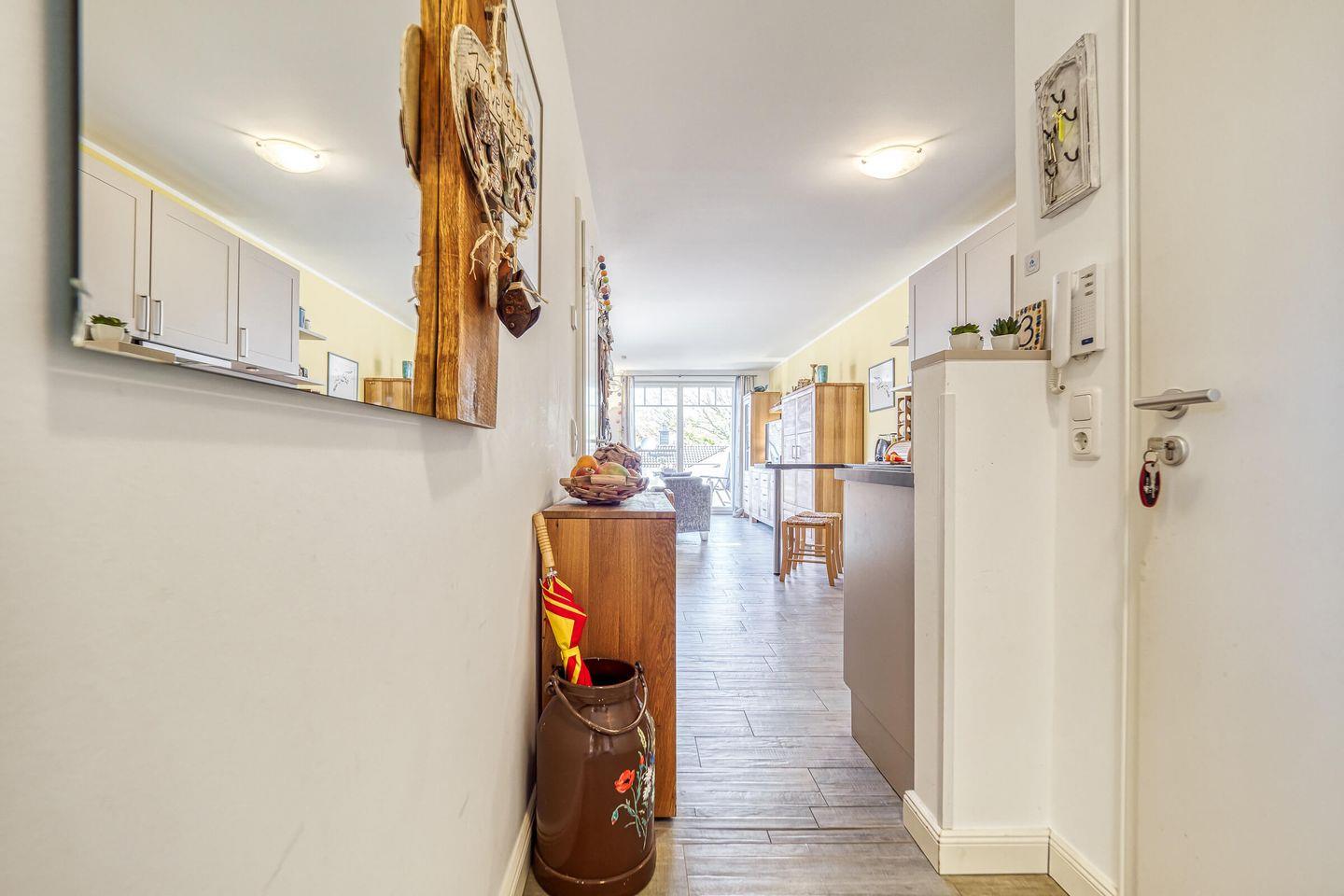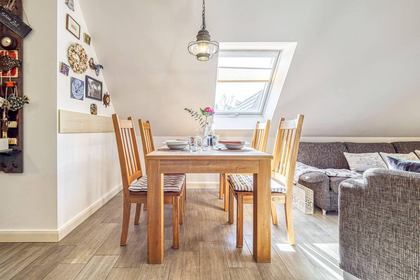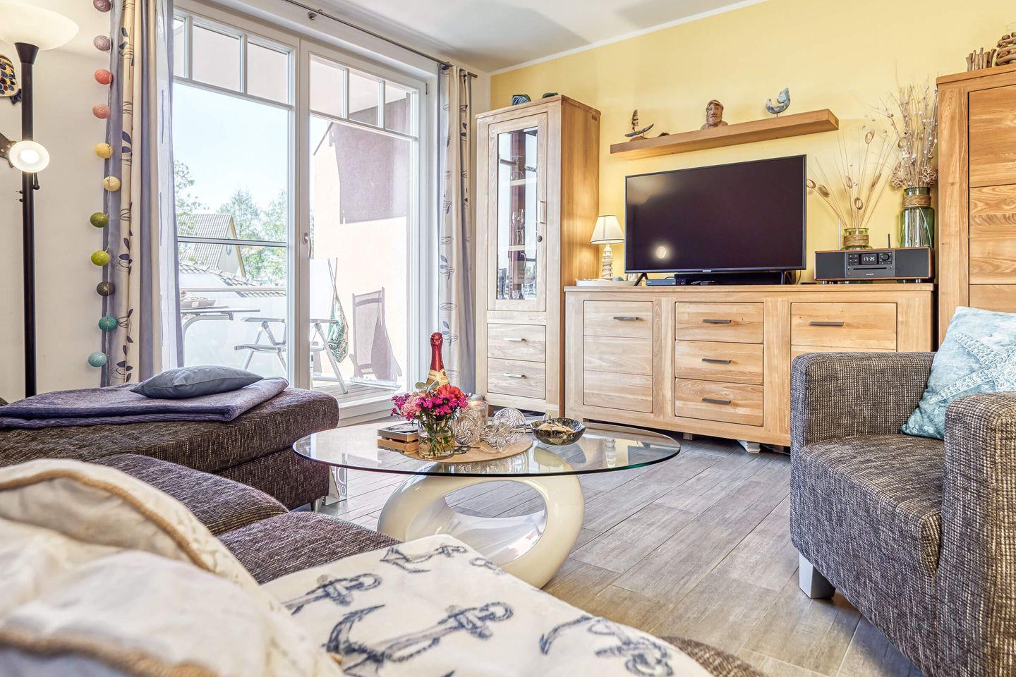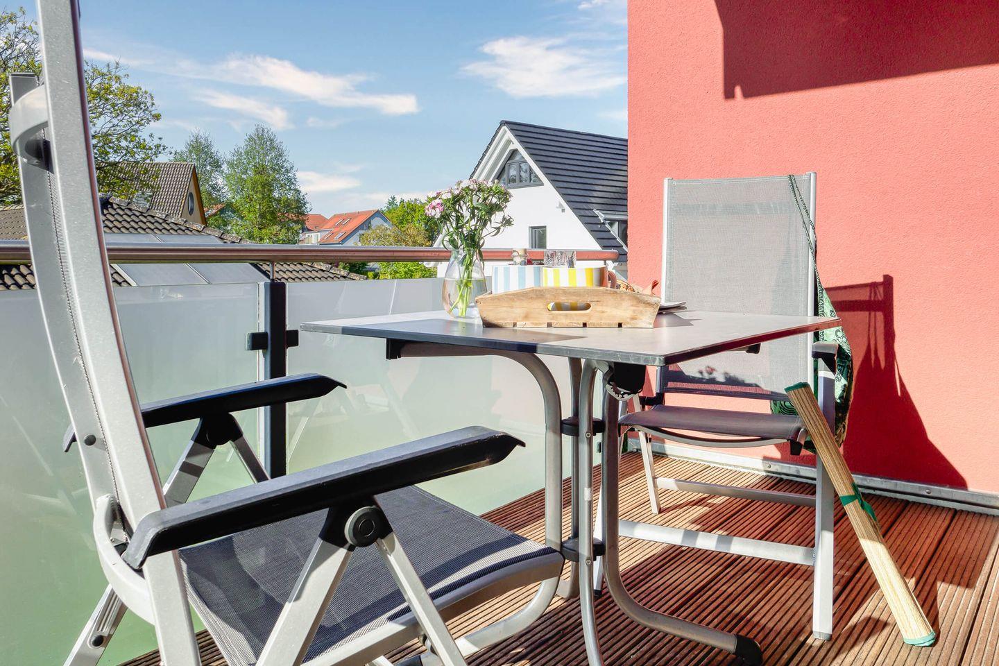 Die Fußbodenheizung sorgt an kühleren Tagen für angenehme Wärme. Ein großer, möblierter Balkon lädt zum Frühstücken oder Entspannen ein. Ein eigener PKW-Stellplatz sowie ein Abstellraum für Fahrräder oder Strandutensilien bieten zusätzlichen Komfort.