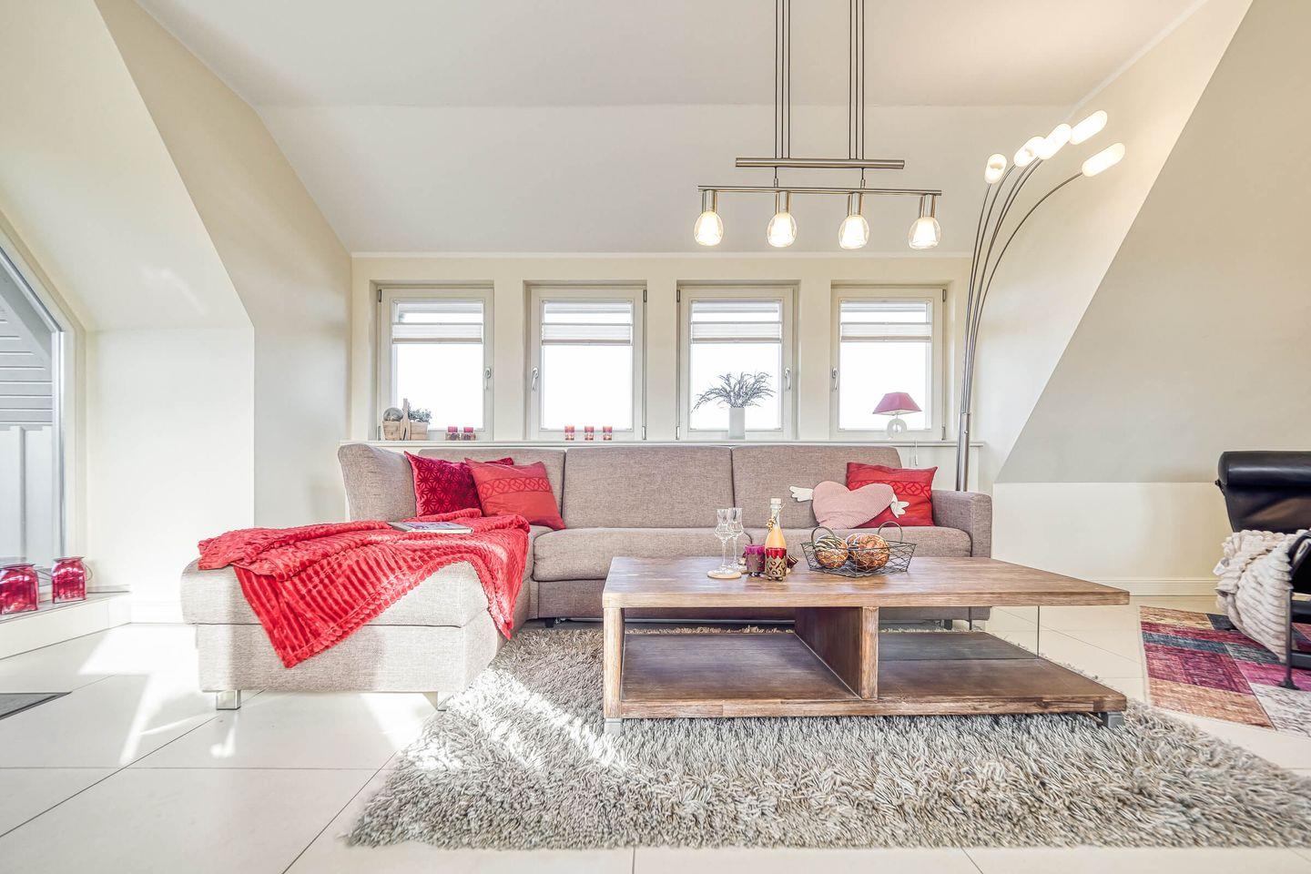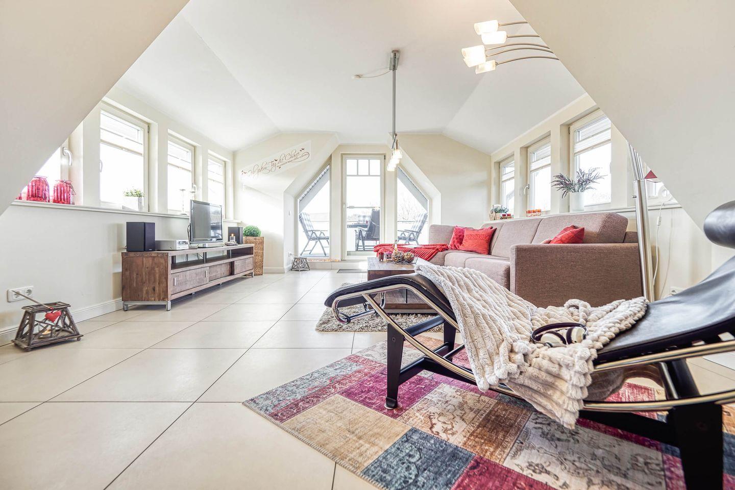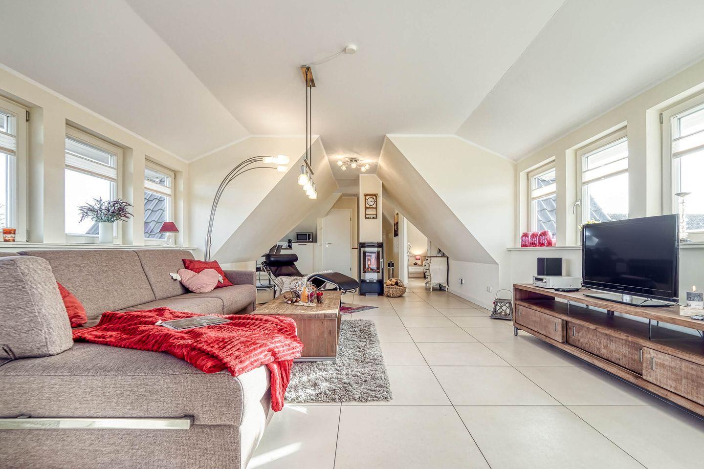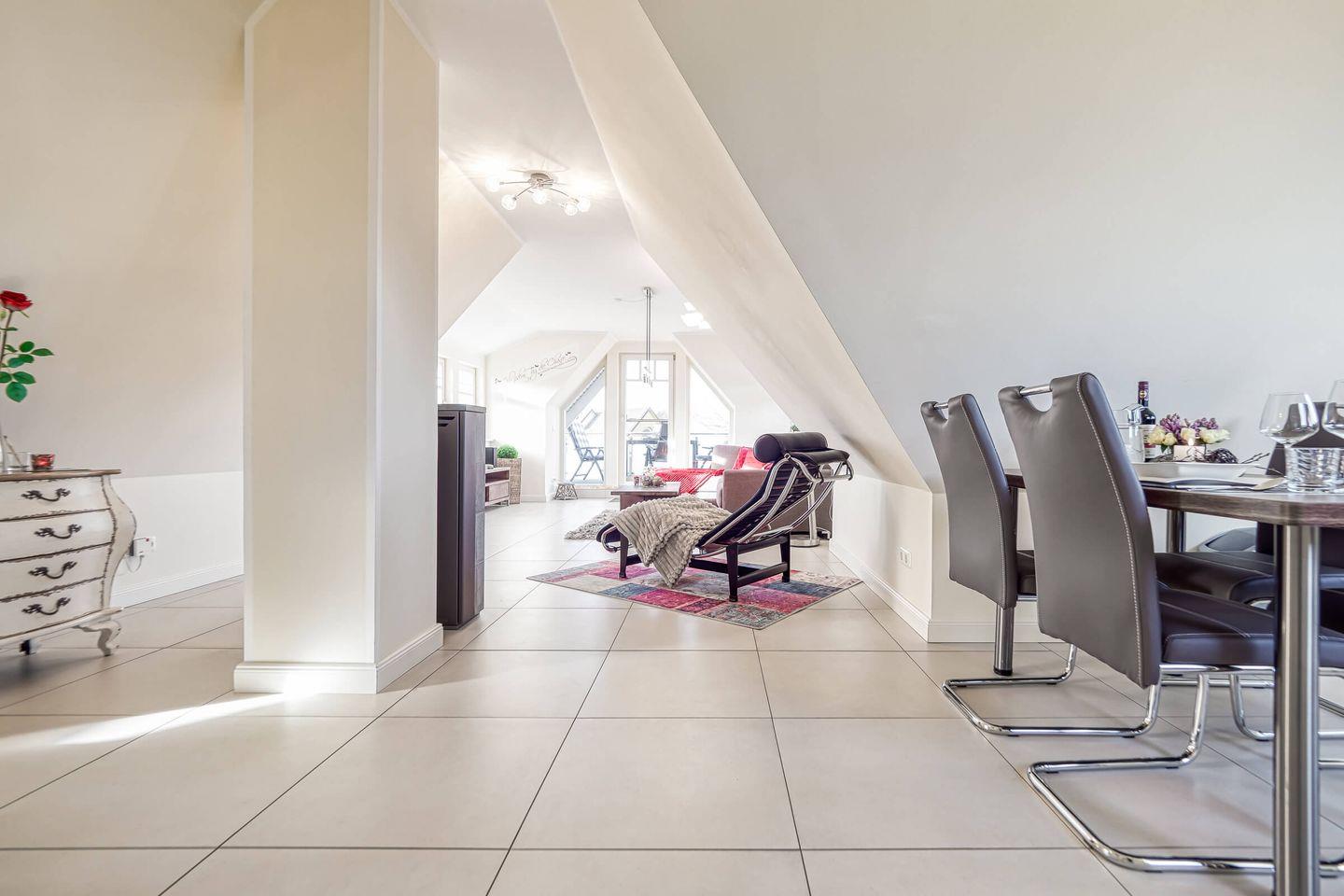Diese moderne Ferienwohnung im Dachgeschoss vereint stilvolle Einrichtung mit gemütlichem Wohnkomfort auf rund 54?m² – ideal für zwei bis drei Personen. In zwei harmonisch abgestimmten Zimmern erwarten Sie ein großzügiger Wohnbereich mit Kamin, ein separates Schlafzimmer sowie ein Badezimmer mit ebenerdiger Dusche.