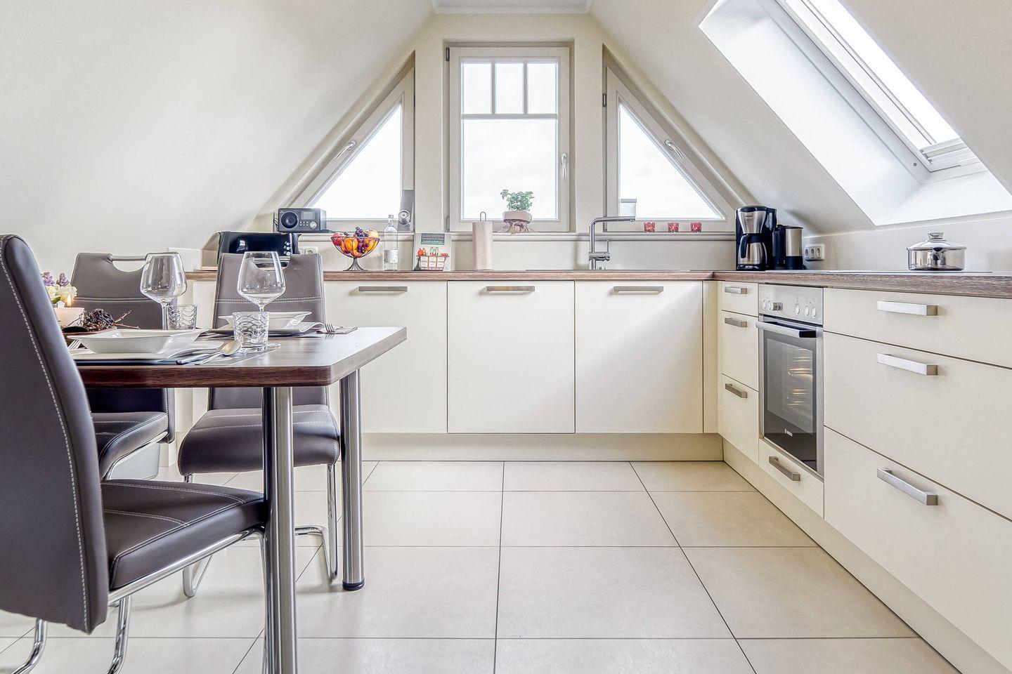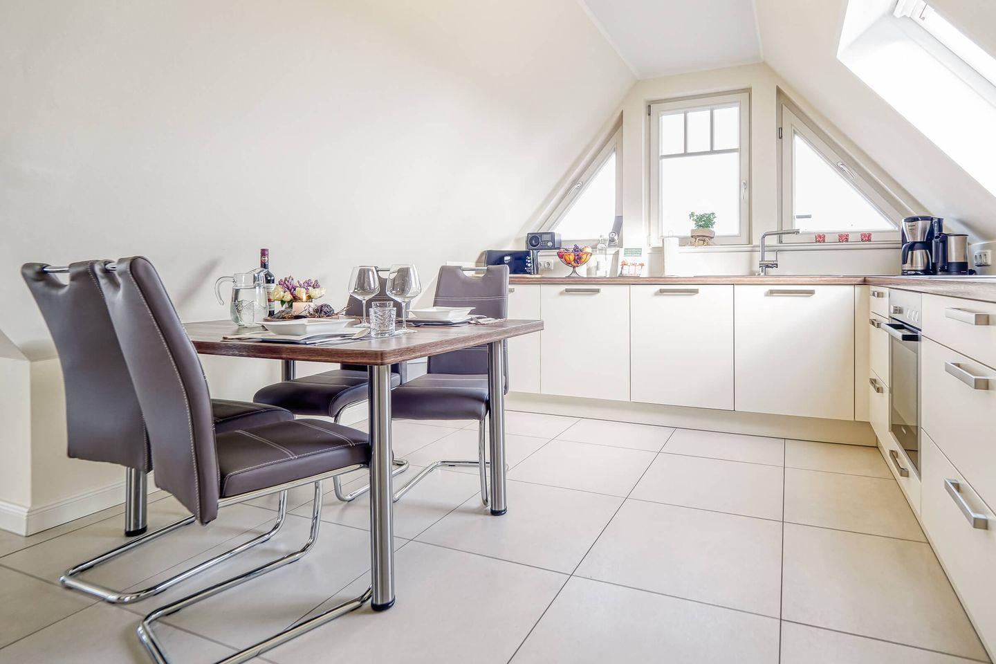 Die offene Küche ist hochwertig ausgestattet und lädt zum entspannten Kochen ein. Auf dem sonnigen Balkon genießen Sie Ruhe und frische Ostseeluft. Die Ferienwohnung befindet sich im zweiten Stock eines gepflegten Hauses und ist ein reines Nichtraucherdomizil. Kinder sind hier herzlich willkommen.