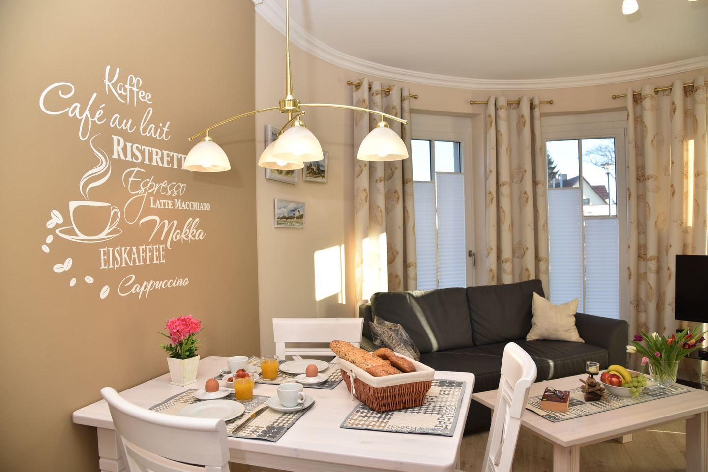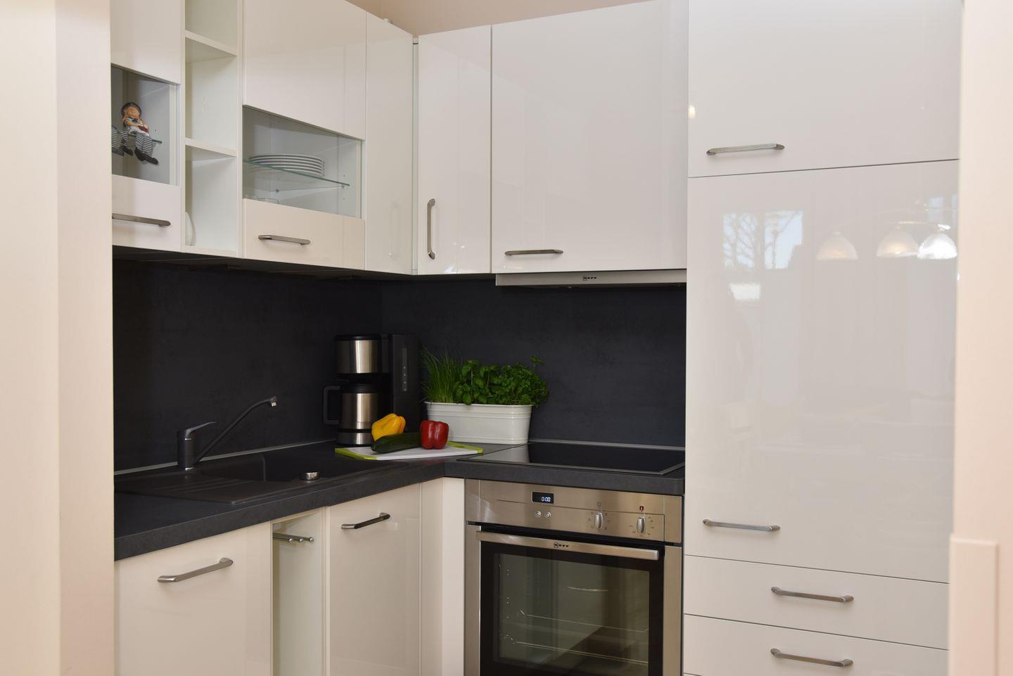 Das Wohnzimmer mit Schlafsofa, Satelliten-TV, und HIFI-Anlage lädt zum gemütlichen Beisammensein ein. Offene Küche mit Geschirrspüler, und Backofen, anschließend eine gemütliche Essecke.