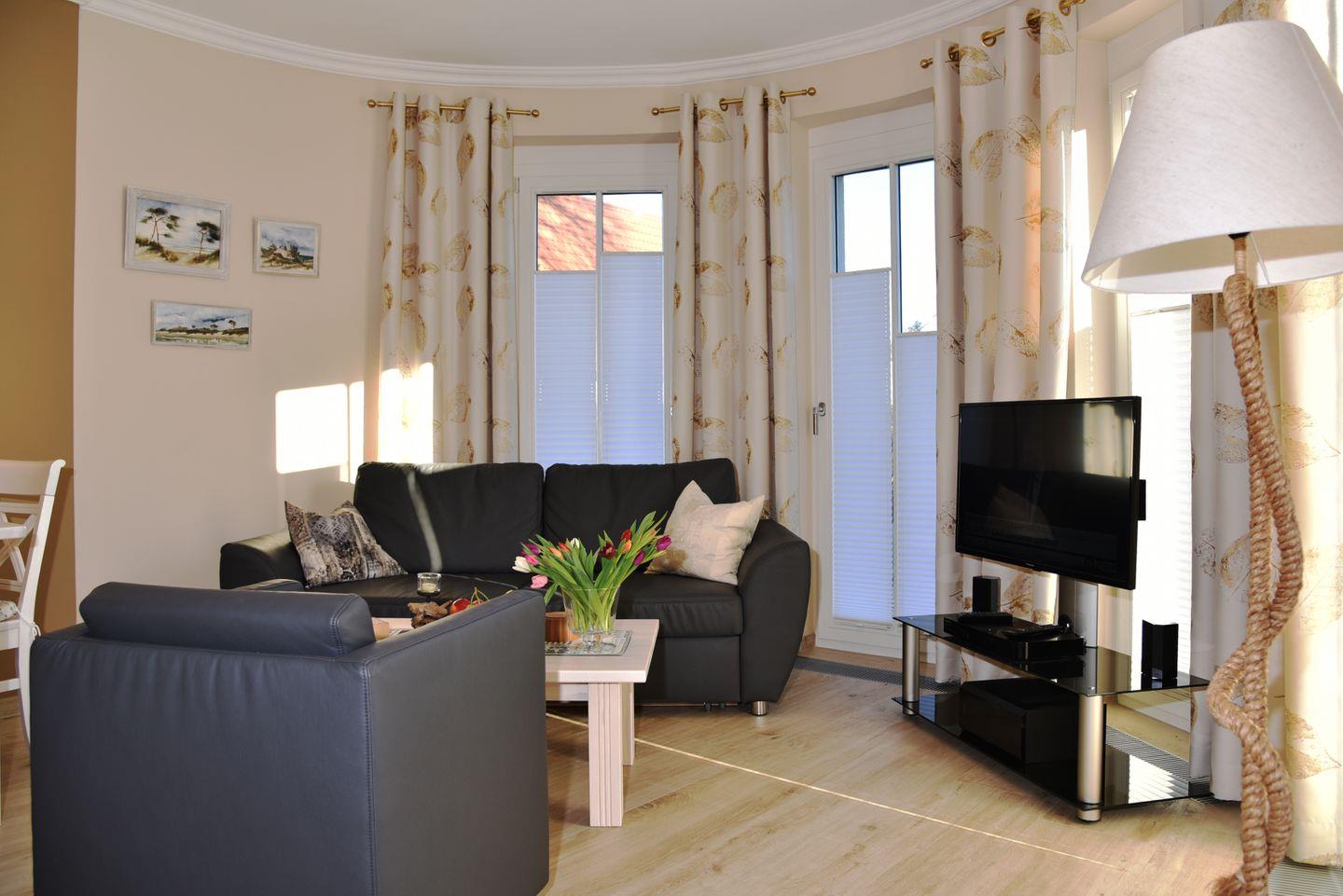 Willkommen in der Strandsuite Klaas Störtebecker, das Wohnzimmer mit Schlafsofa, Satelliten-TV, kostenloses W-LAN und HIFI-Anlage lädt zum gemütlichen Beisammensein ein.