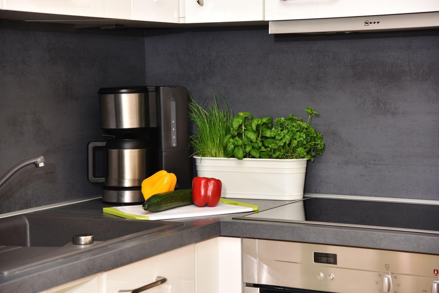 Küche mit Geschirrspüler, Mikrowelle und Backofen, integrierter Essecke.