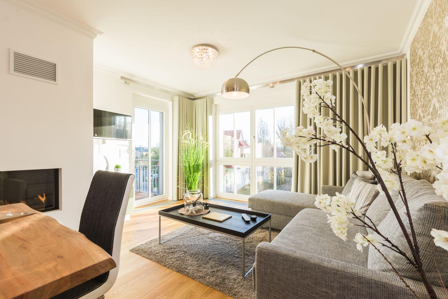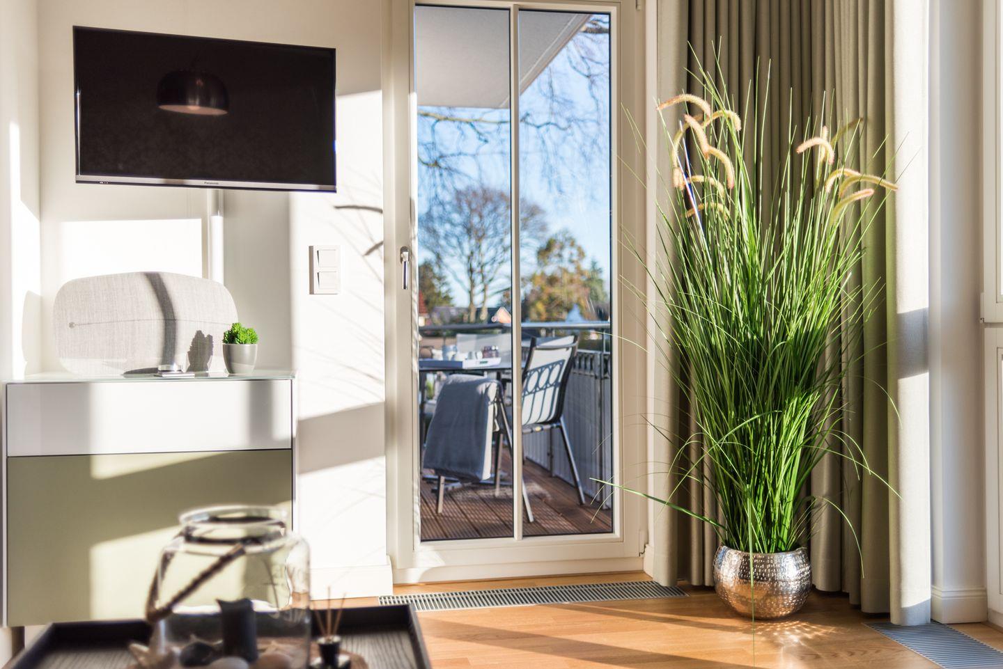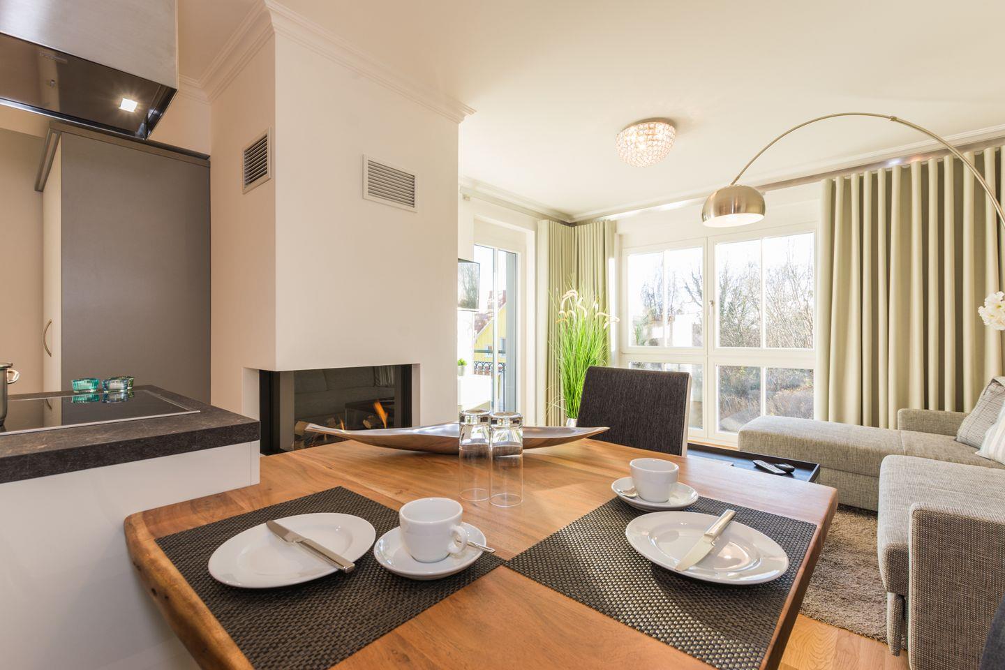 Durch bodentiefe, nach Süden ausgerichtete Fenster im Schlafzimmer und Wohnzimmer ist die Strandsuite besonders lichtdurchflutet und hell und lässt hinsichtlich Gemütlichkeit und luxuriöser Ausstattung keine Wünsche offen.