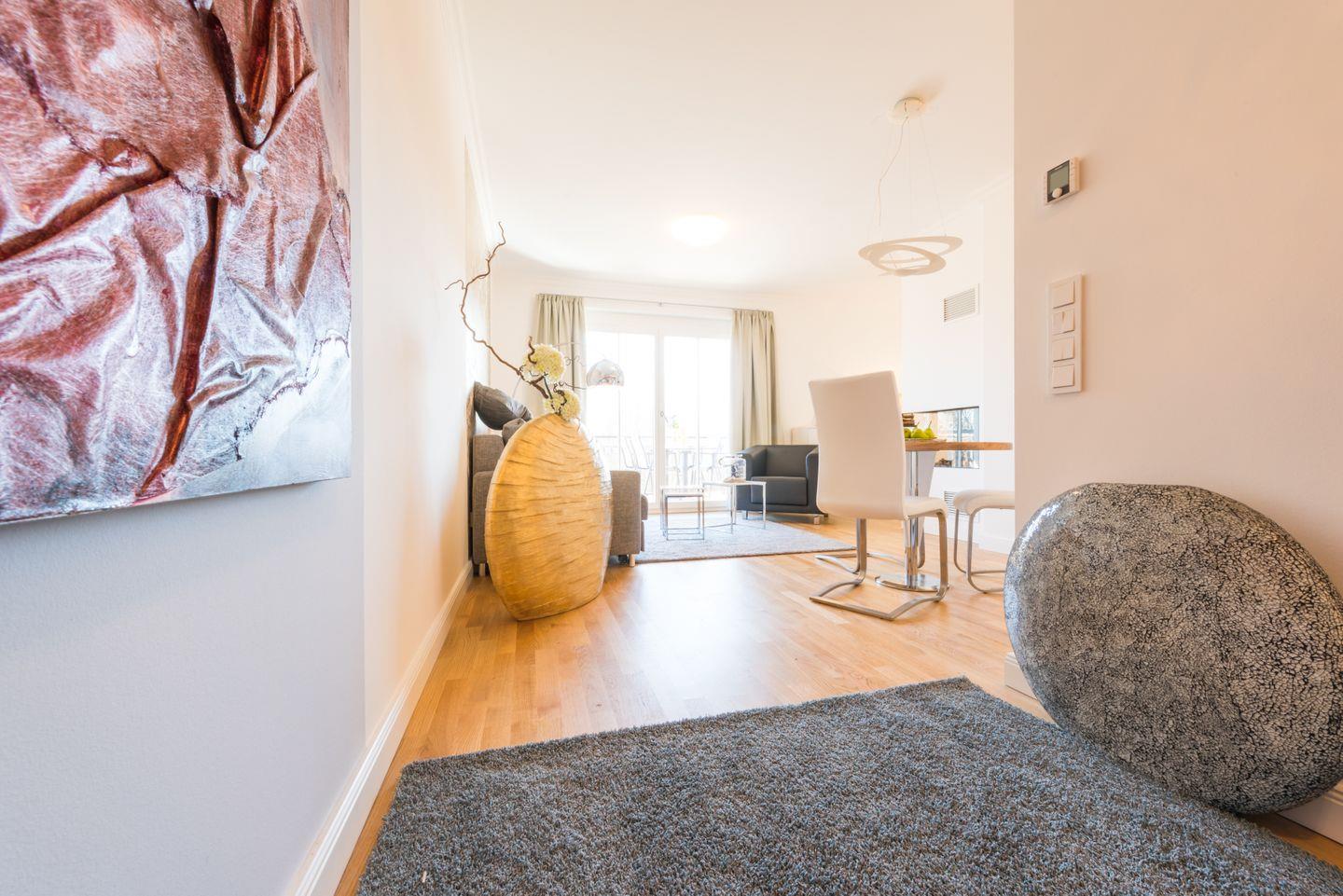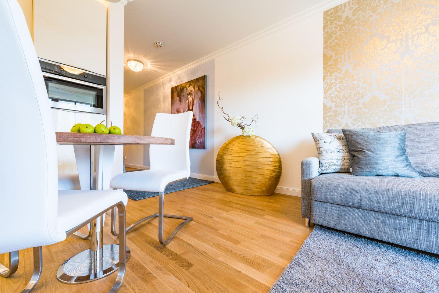 Die 2 Raum Suite WE 11 verfügt über 57 m² Wohnfläche. Hier empfängt Sie über dem Eingangsbereich das Wohn- und Esszimmer mit einer hochwertigen Küchenzeile.