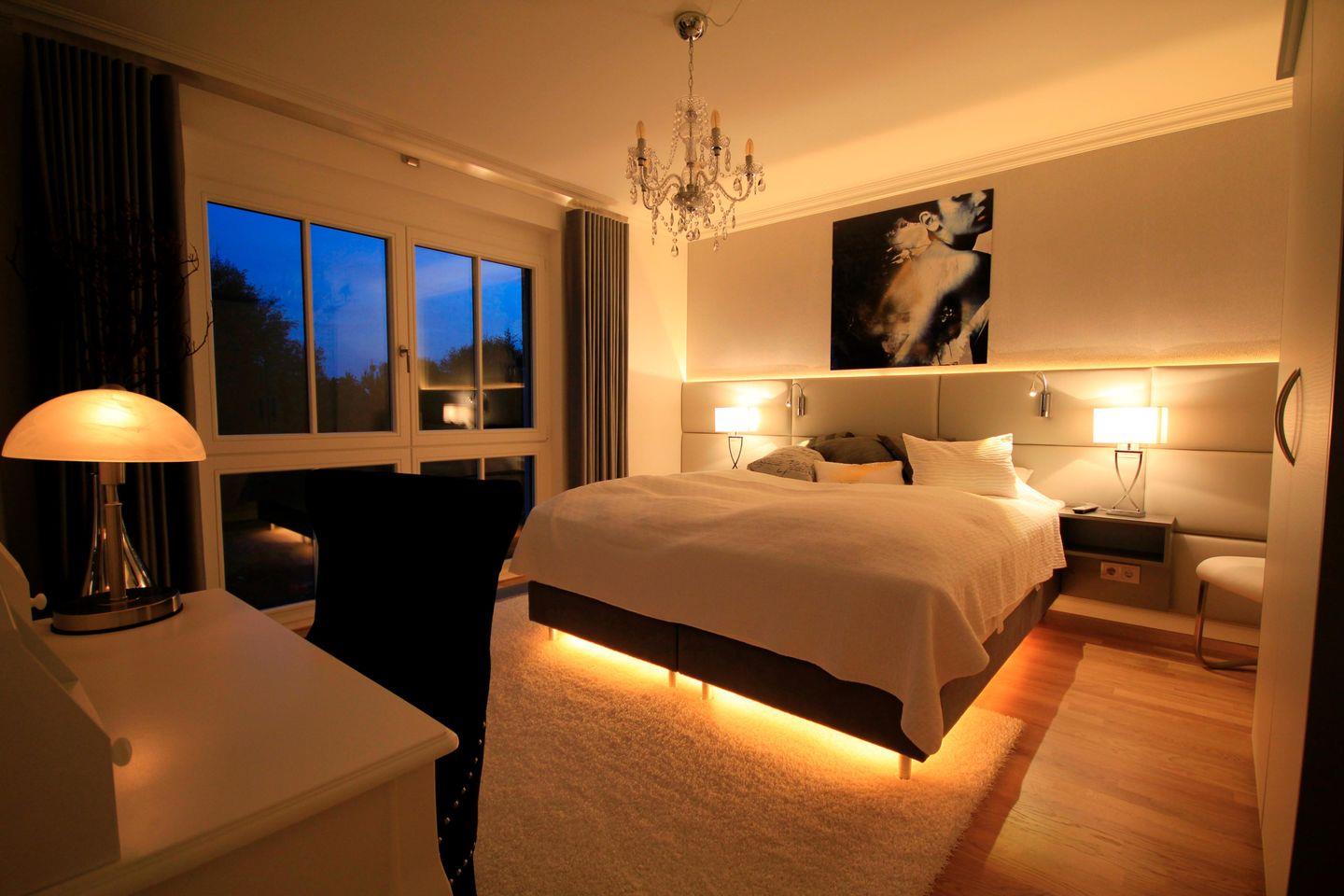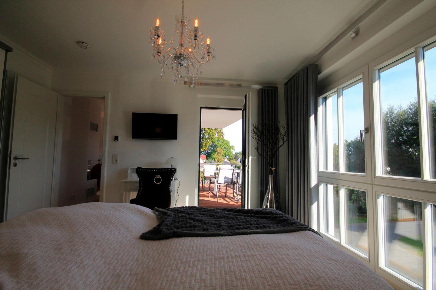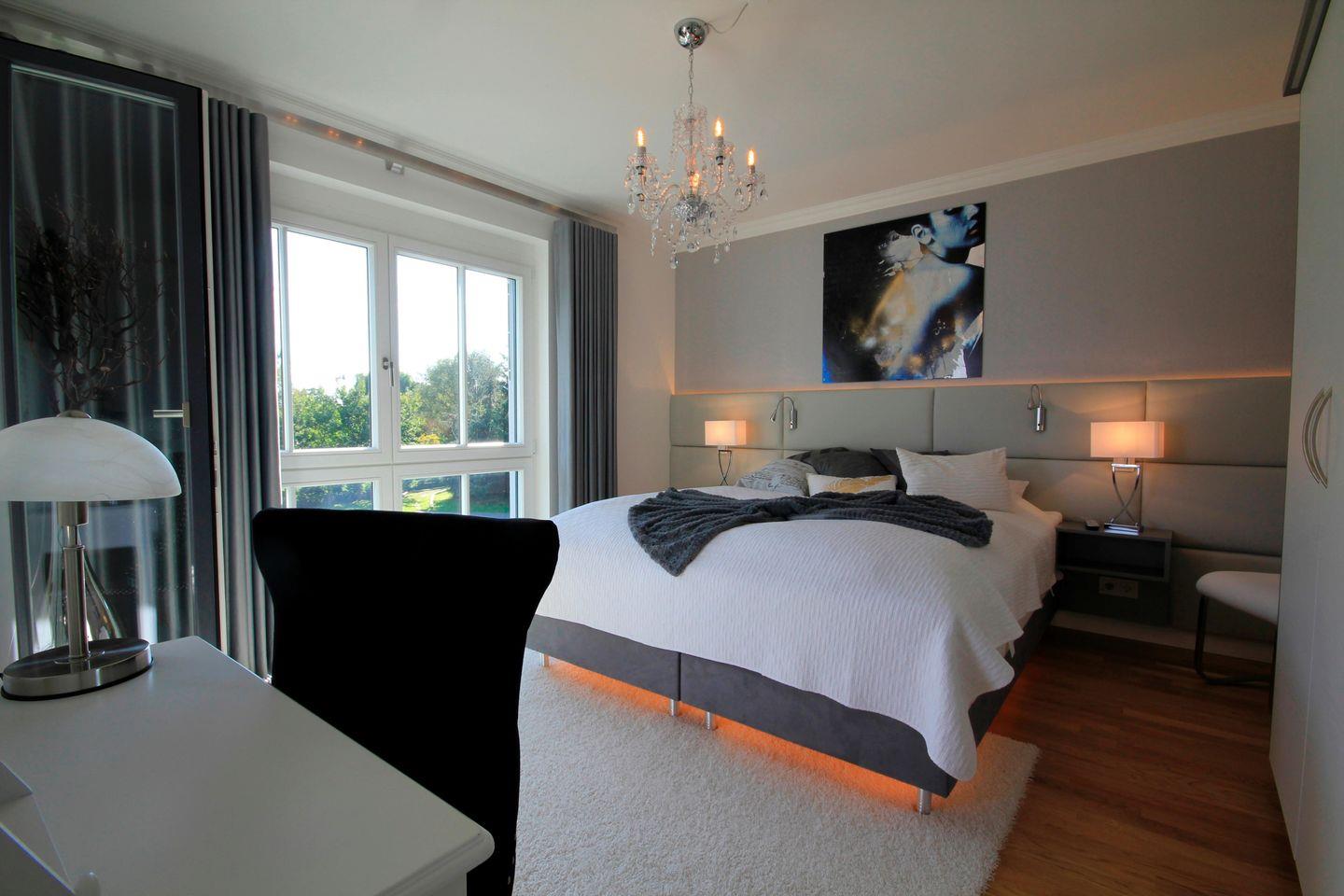 Das Schlafzimmer ist sehr komfortabel mit einem Boxspringbett, Sessel, Sekretär und einem zweiten Fernseher eingerichtet.