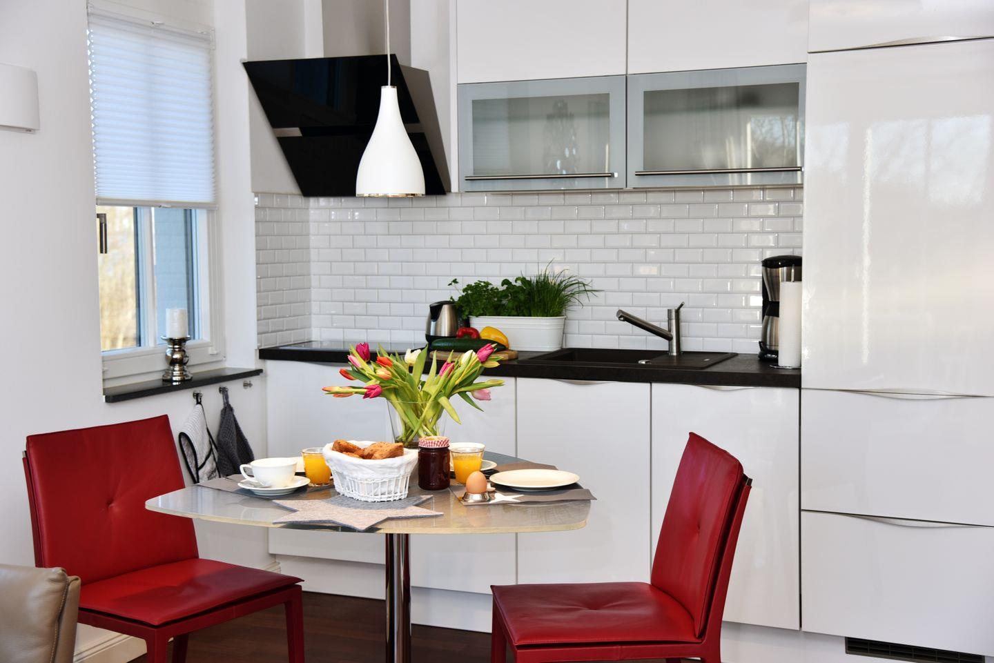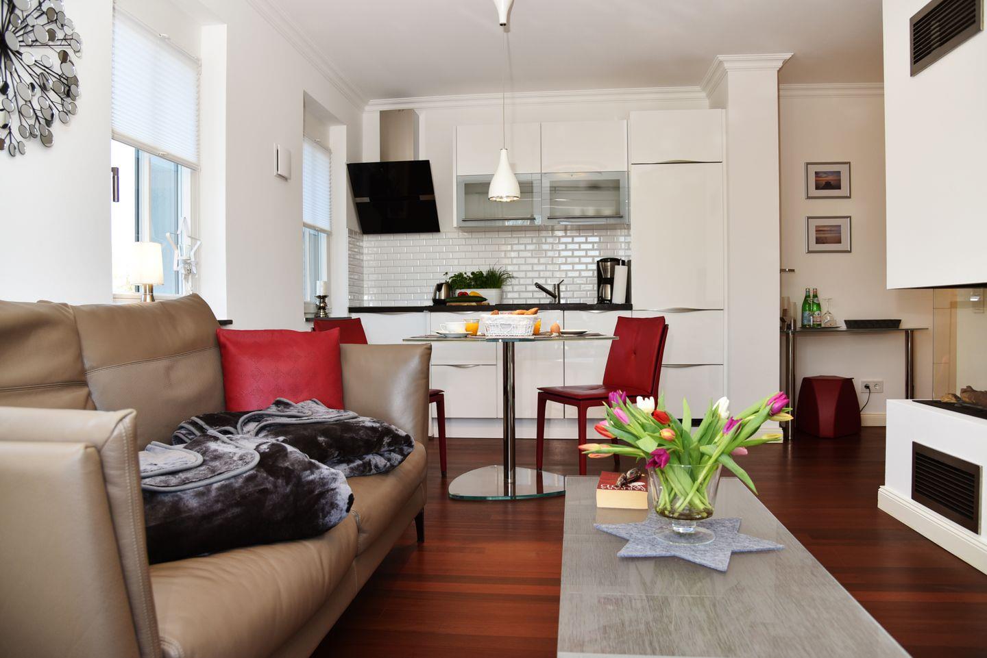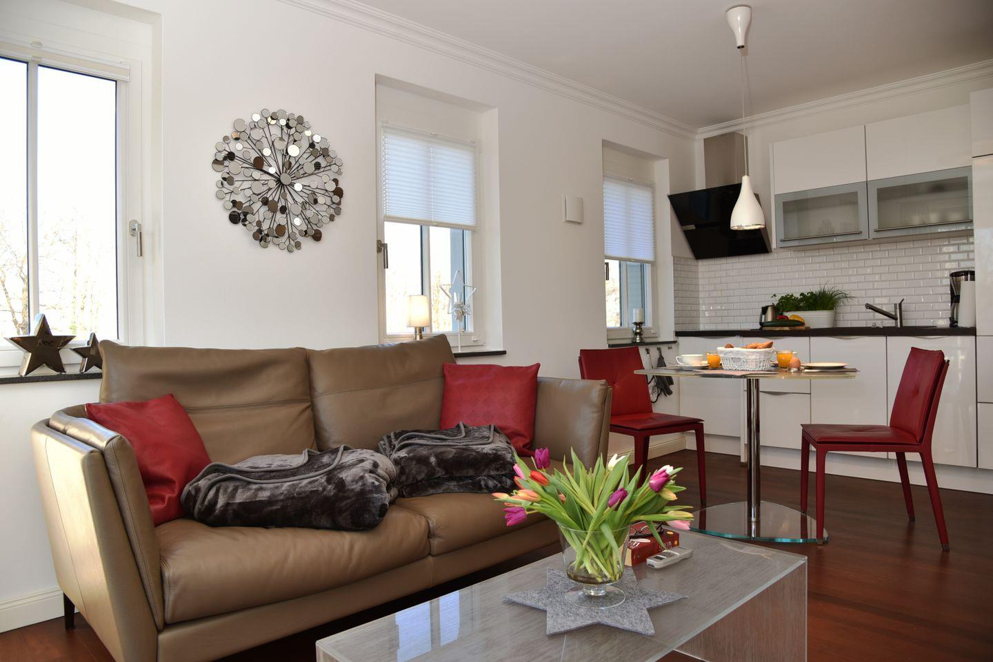 Am Gaskamin im lichtdurchfluteten Wohn-/ Essbereich entspannen Sie auch bei kühler Witterung in behaglicher Wohlfühlatmosphäre. Vom zeitlos möblierten nach Westen ausgerichteten Balkon blicken Sie auf die Promenade in Richtung Seebrücke und genießen den Sonnenuntergang.