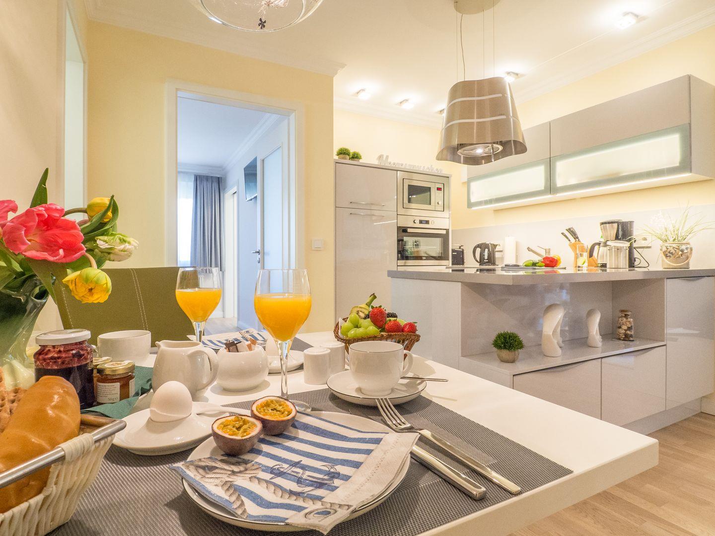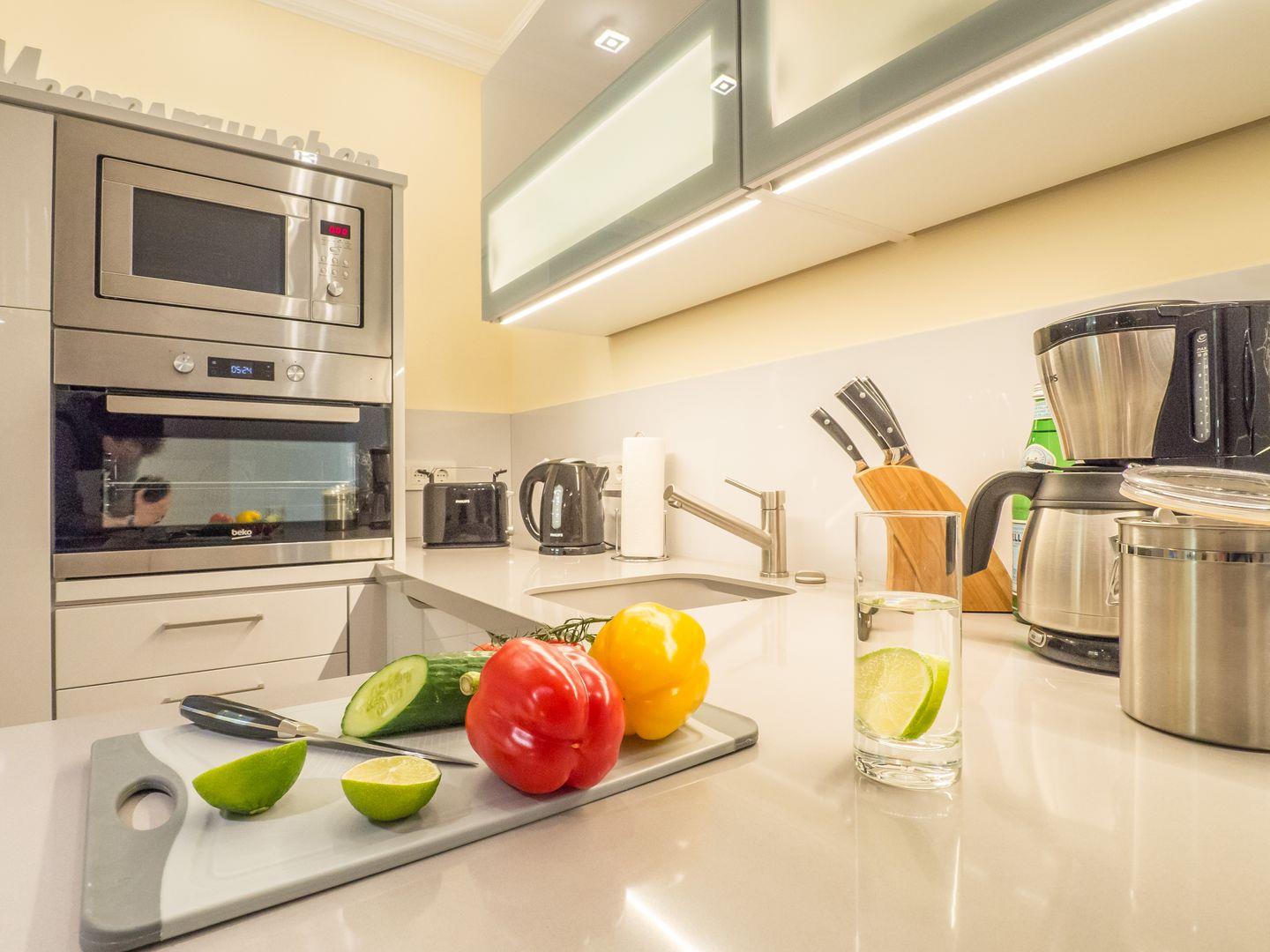Die komplett ausgestattete Küche mit Backofen, Cerankochfeld, Geschirrspüler, Kühlschrank, Mikrowelle, Kaffeemaschine, Toaster, Wasserkocher lässt keine Wünsche offen.