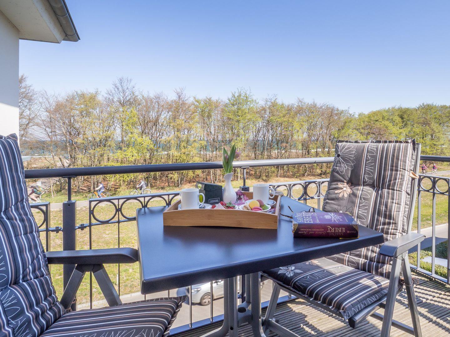 Beginnen Sie den Tag bei schönem Wetter mit einem Frühstück auf dem Balkon mit direktem Blick auf die Ostsee (im Sommer durch die Vegetation eingeschränkt).