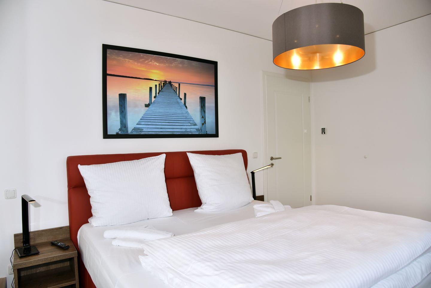 Zur Suite gehört eine neu ausgestattete Küchenzeile, ein Bad mit ebenerdiger Dusche und 2 Schlafzimmer mit Boxspringbetten.