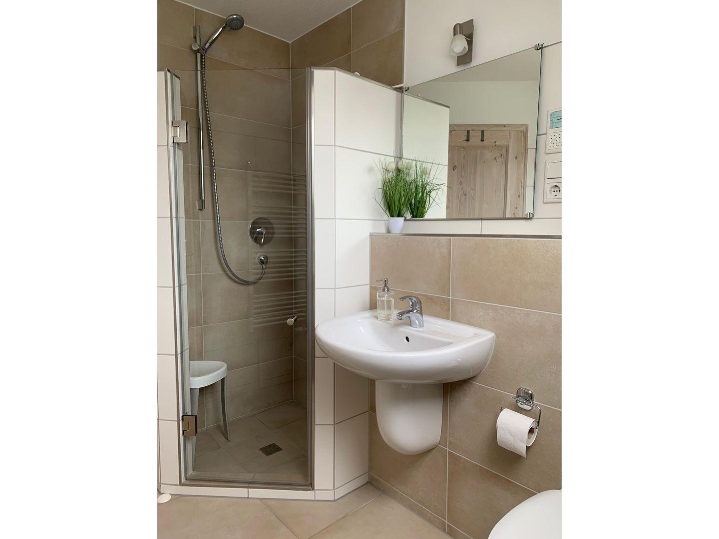 Das Schlafzimmer ist mit einem Doppelbett eingerichtet und das Badezimmer verfügt über eine ebenerdige Dusche.