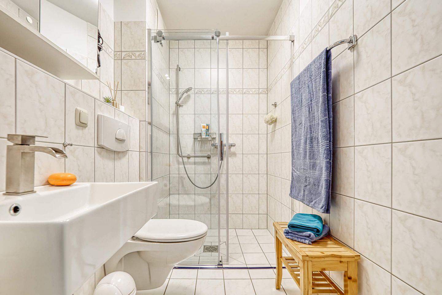 Für Gäste mit eingeschränkter Mobilität wurde Wert darauf gelegt, die Wohnung barrierearm zu gestalten. Es gibt keine Treppenstufen, Haus- und Wohnungseingang sind ebenerdig, die Dusche bodentief und der eigene Parkplatz befindet sich direkt vor der Tür.