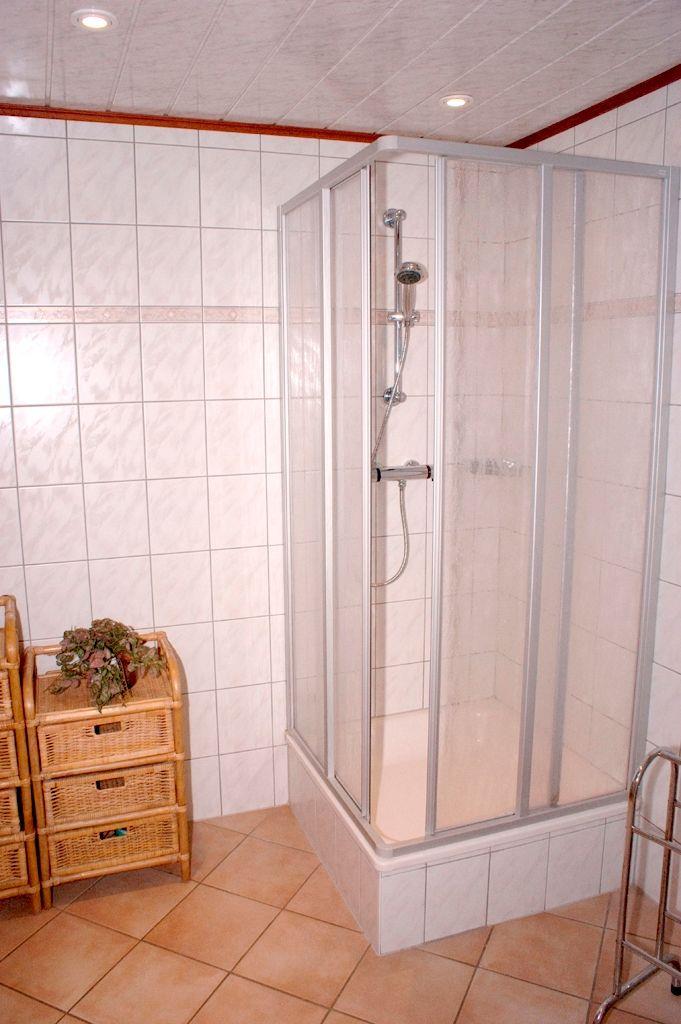 Das große Badezimmer ist mit einer Dusche ausgestattet.
