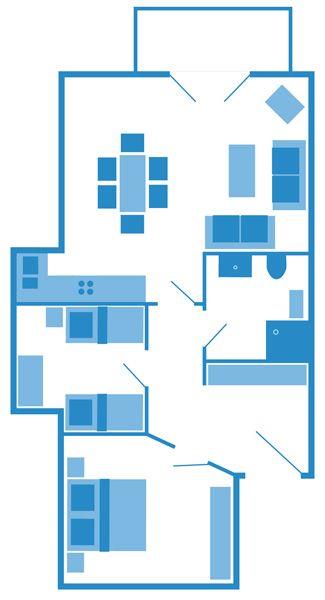 Zur Wohnung gehört ein Wohnzimmer mit Terrasse, 2 Schlafzimmer (1x Doppelbett und 1x ein Einzelbett und Etagenbett), eine Einbauküche mit Geschirrspüler, Elektroherd und weiteren technischen Geräten, sowie SAT-TV W-Lan-Zugang und Stereoanlage.