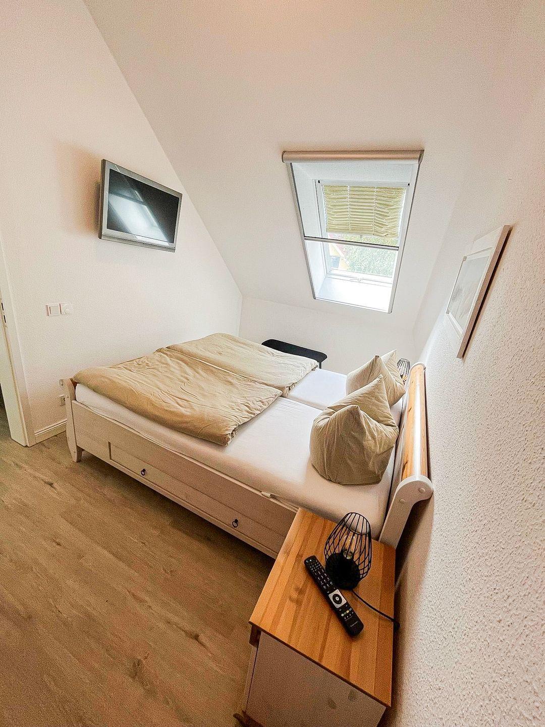 Das separate Schlafzimmer mit Doppelbett und TV bietet Platz für zwei weitere Personen.