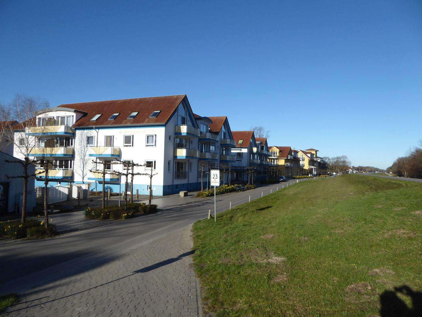 Auf dem überdachten Ost-Balkon kann man in der Sonne gemütlich frühstücken und das Treiben auf dem Deich beobachten.