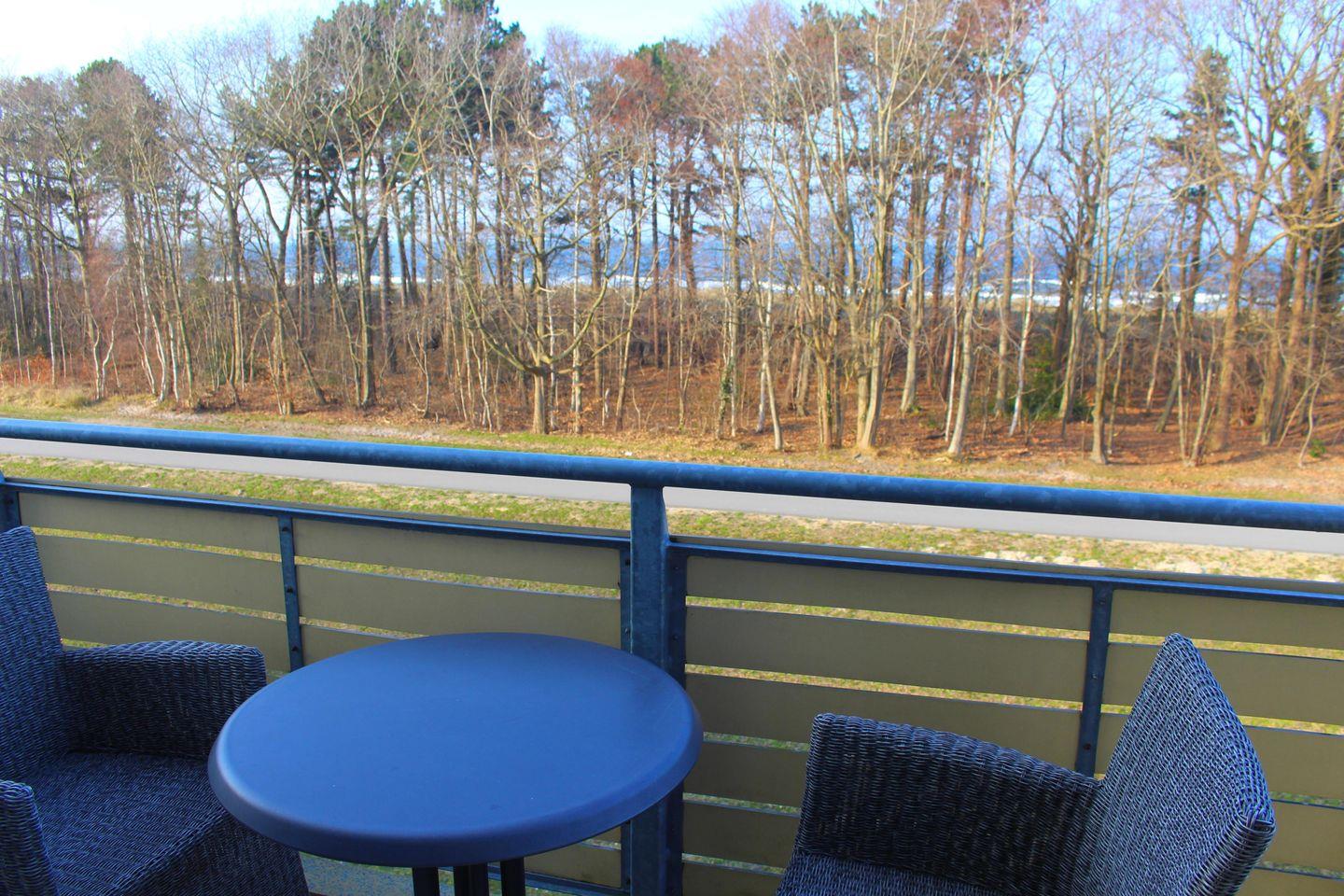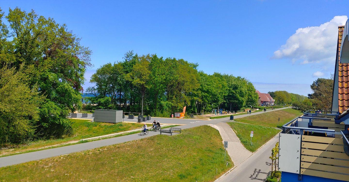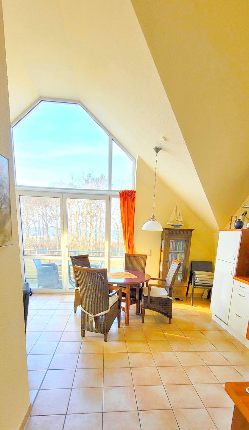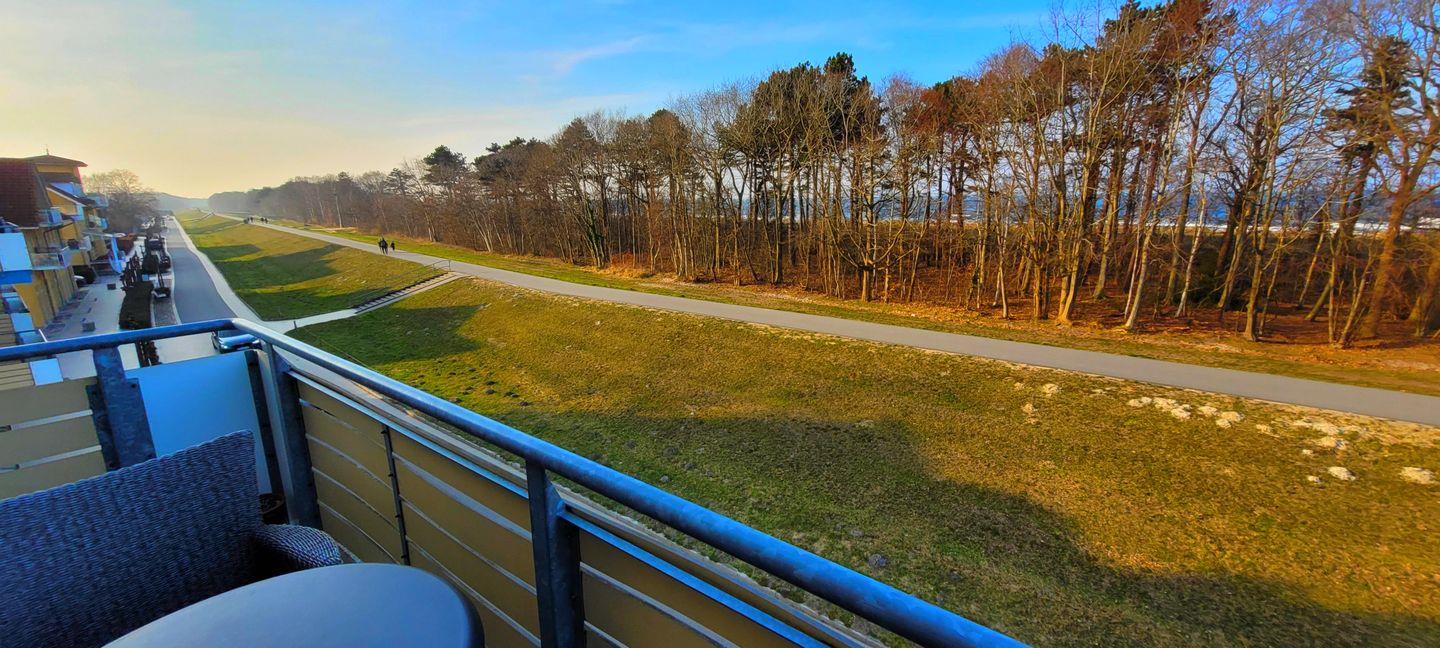 Die Wohnung befindet sich im 2. OG und hat zur See hin ein großes Panoramafenster mit angeschlossenem Balkon. Im Sommer schauen wir auf den Deich - in das grüne der Bäume, im Winter sehen wir auf die oft unruhige Ostsee.